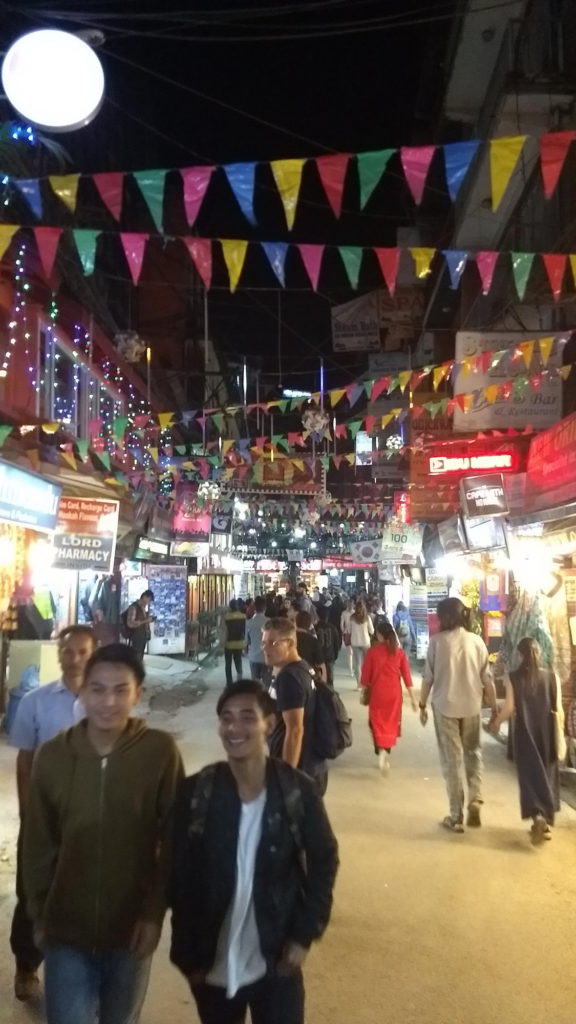 Na een opfrisbeurt gaan we op verkenning in Thamel. Het blijkt een bruisend centrum te zijn waar veel backpackers vertoeven. Een gezellige bedoening! Het is al redelijk vroeg donker, maar dit maakt het nog charmanter. Als je nog spullen nodig zou hebben kan je ze hier zeker op de kop tikken voor een prikje. Alles ziet er kwalitatief degelijk uit, maar een garantie heb je niet, dus wandelschoenen en rugzak koop je hier best niet, maar neem je van thuis mee. Aangezien wij nog geen rupees hebben, gaan we eerst op zoek naar een wisselkantoortje om euro’s te wisselen. Er zijn veel wisselkantoortjes in Thamel, dus je hoeft je hierover geen zorgen te maken.