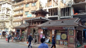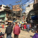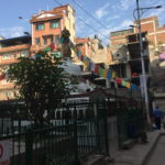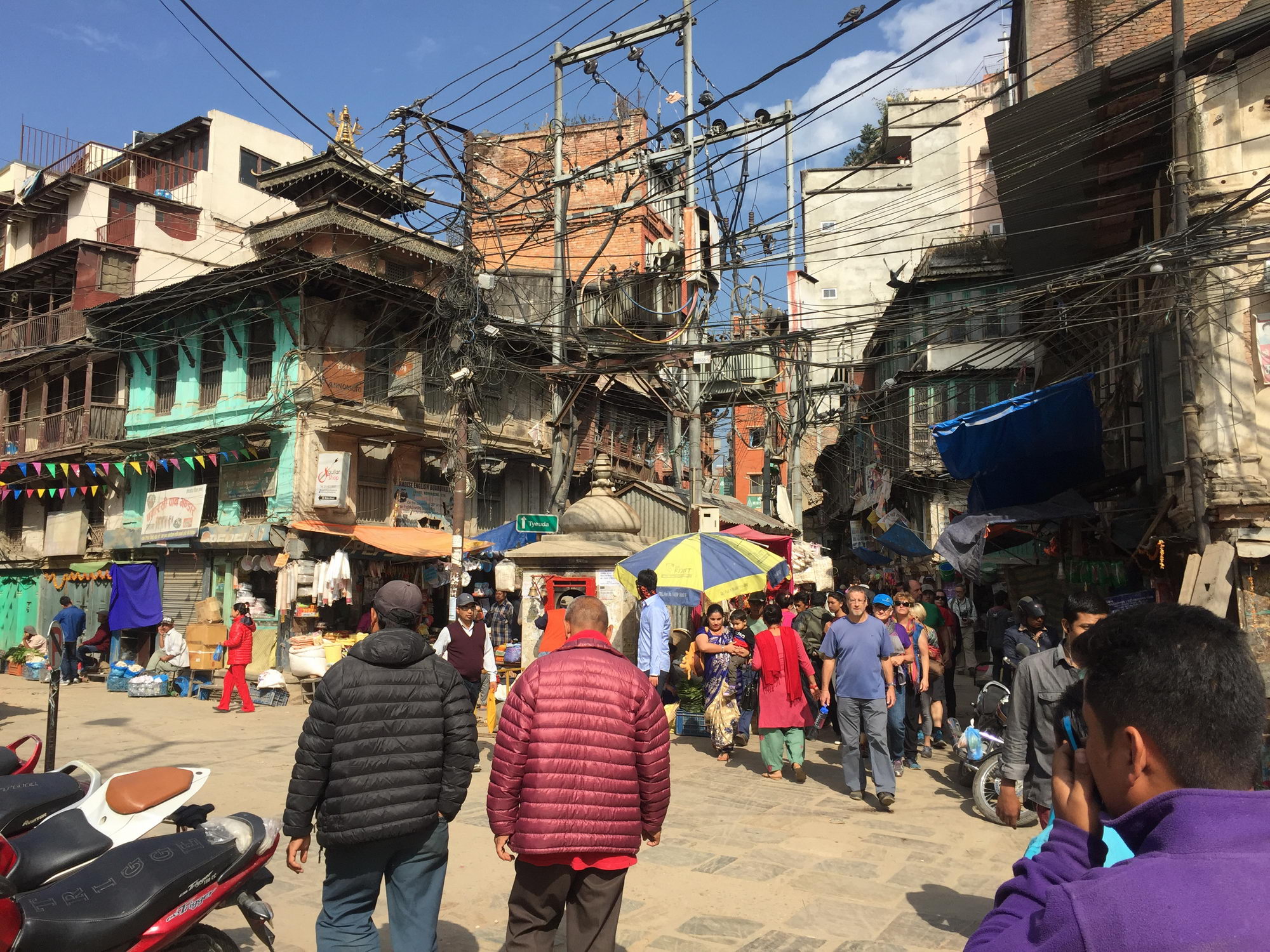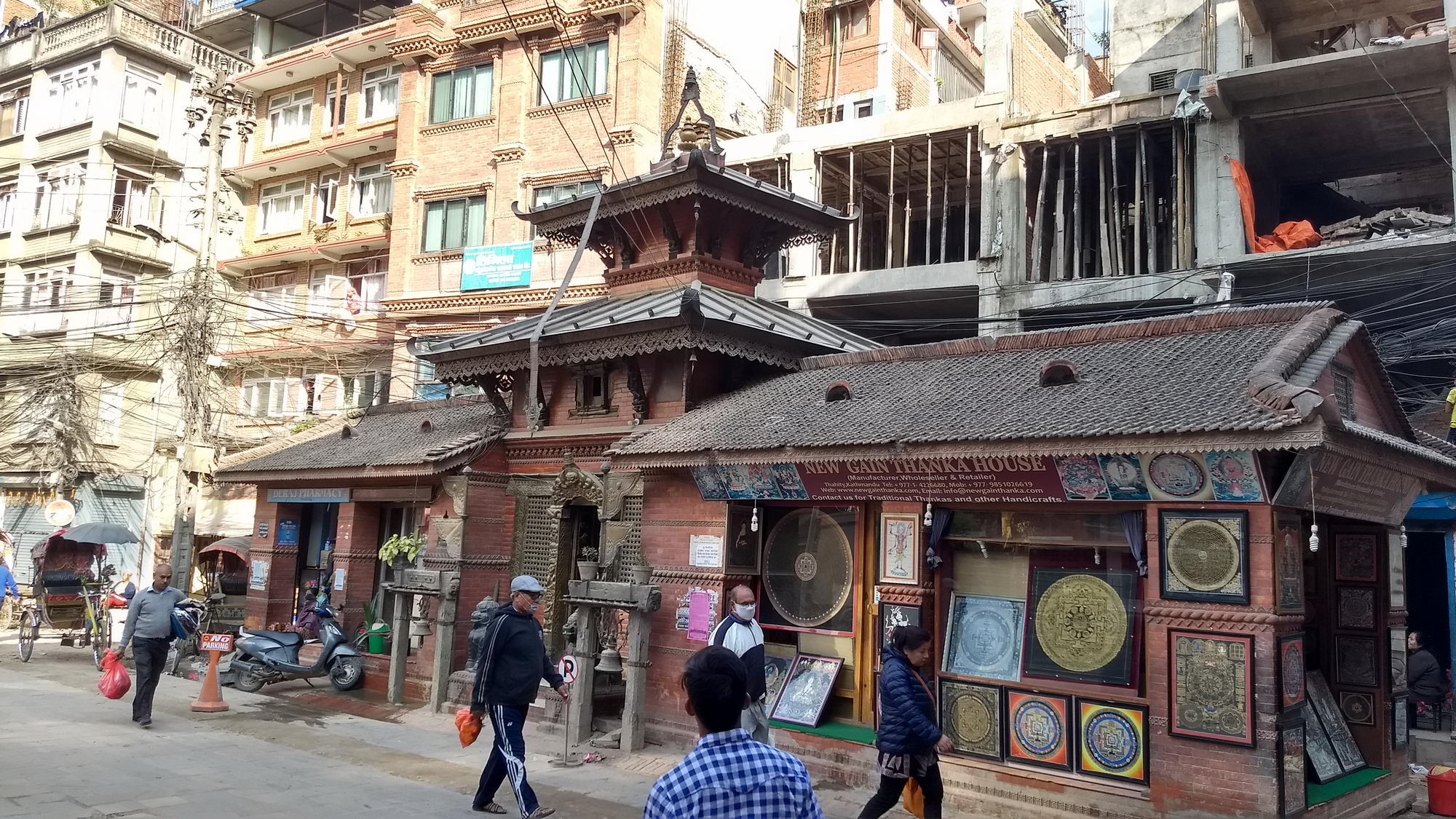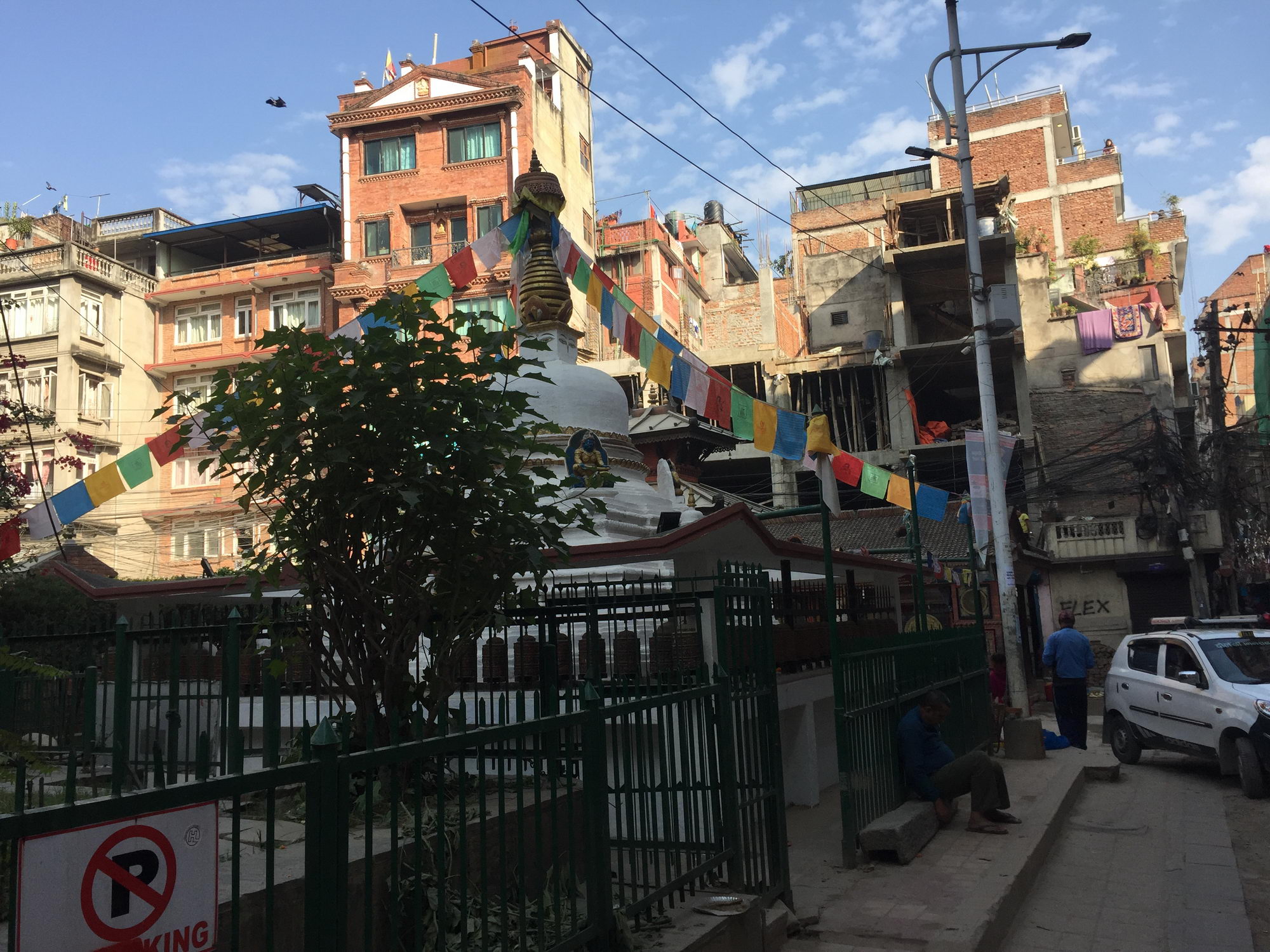 Tijdens de wandeling van en naar de toeristische dienst snuif je de sfeer op van het bruisende leven van de locals. In een wirwar van straatjes wandel je langs ontelbare winkeltjes waar ze gewoonweg alles verkopen. Her en der duiken stoepa’s en Hindu tempels op. Taxi’s, moto’s, auto’s, riksja’s,… moeten allemaal door de smalle straatjes. Een drukte van jewelste! Af en toe zie je nog gebouwen die het hard te verduren gehad hebben tijdens de aardbevingen van 2015, maar al bij al is de schade veelal opnieuw opgebouwd en hersteld. Je maakt ook kennis met het stof en de smog van Kathmandu en dat is toch ook even wennen als je dat niet gewoon bent. Veel locals lopen met mondmaskertjes rond en dat lijkt inderdaad geen overbodige luxe als je daar elke dag door moet.