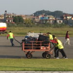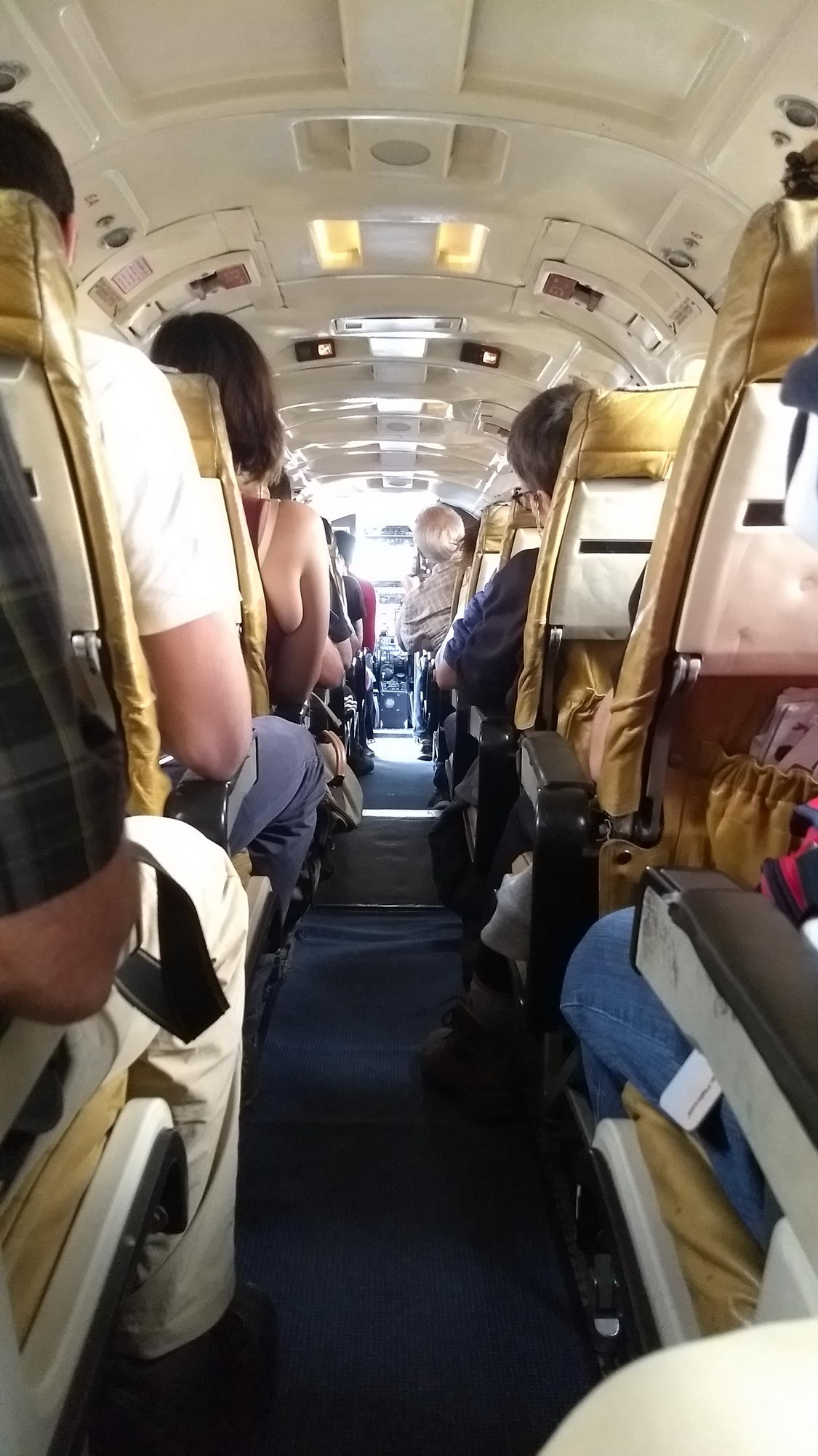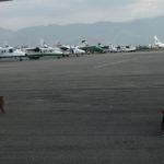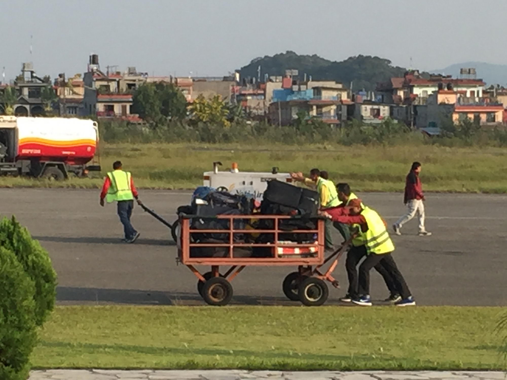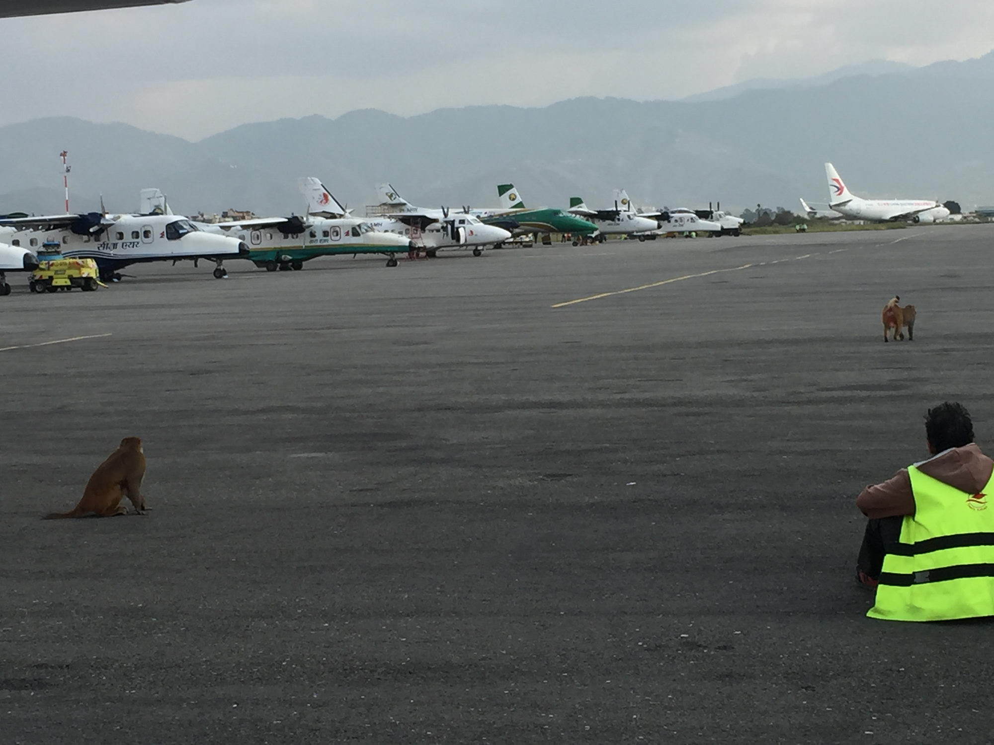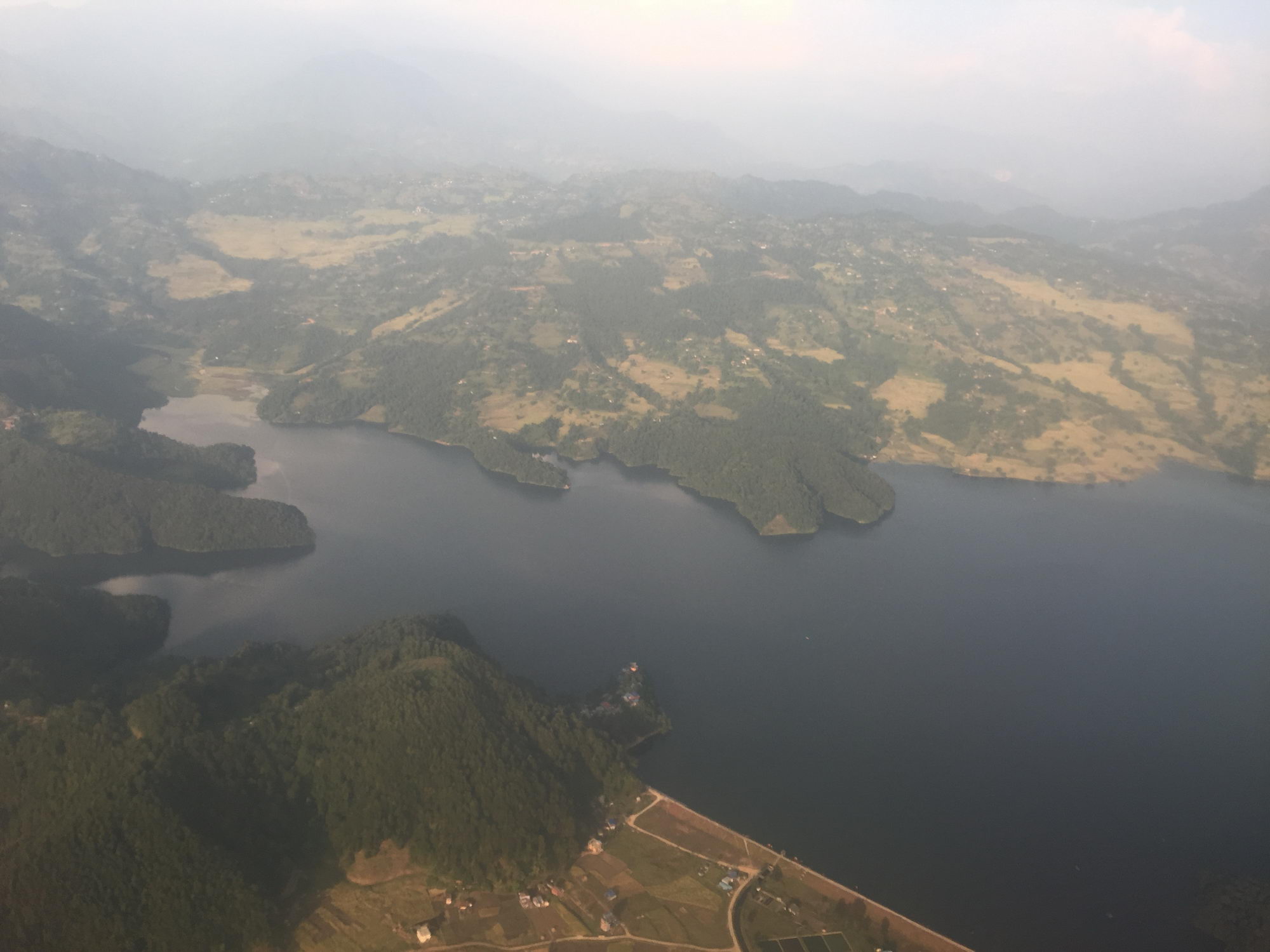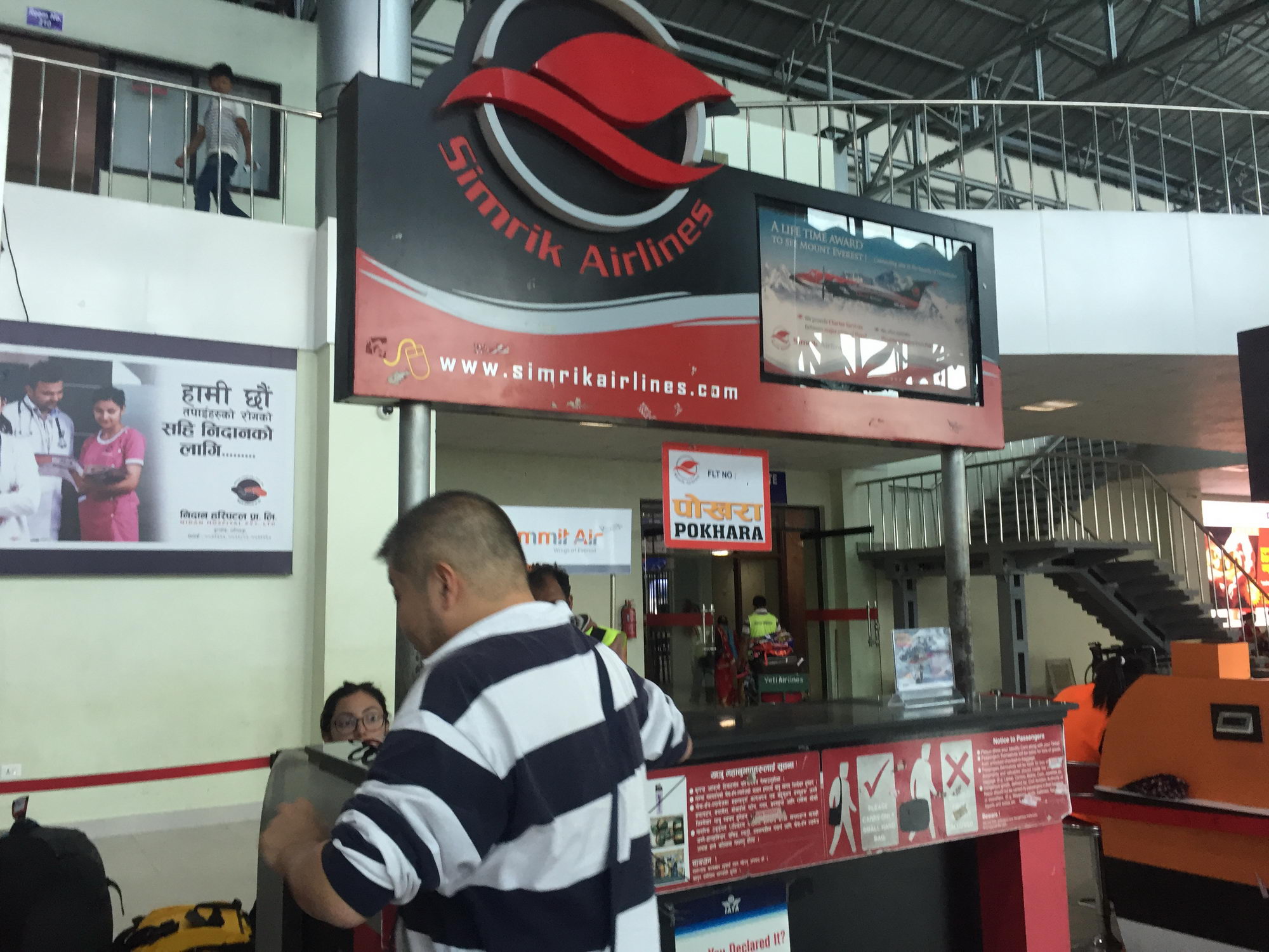 Ook hier is de controle strikt gescheiden en fouilleren is standaard procedure. In de vertrekhal is het gezellig druk en met slechts 2 gates heeft de omroeper veel werk. Om 14u30 zitten we er nog steeds en geen kat die weet wanneer we vertrekken. Er is ook niemand van Simrik Airlines te bespeuren. Bon, van een beetje wachten gaan we niet dood. Om 15u30 zitten we daar naar steeds. Om 16u zien we medewerkers van Simrik zich aan de gate opstellen. Yep, het is aan ons! We worden met een busje aan het vliegtuigje afgezet. We zijn met een twintigtal passagiers, dus boarden gaat snel. Na wat aanschuiven aan de startbaan zitten we in de lucht. Jammer genoeg is het bewolkt, dus we zien weinig van de Himalaya. Af en toe vangen we een glimp op van een bergtop, maar de mooie vergezichten blijven achterwege. Na 25 minuten vliegen zetten we alweer de landing in. We vliegen boven het platteland van Pokhara, wat een aantal adembenemend mooie views oplevert. Na een scheerbocht zetten we de landing in en even later staan we op de tarmac in Pokhara. Een kleine luchthaven, waar de mensen de taak van machines en wagens nog op zich nemen.