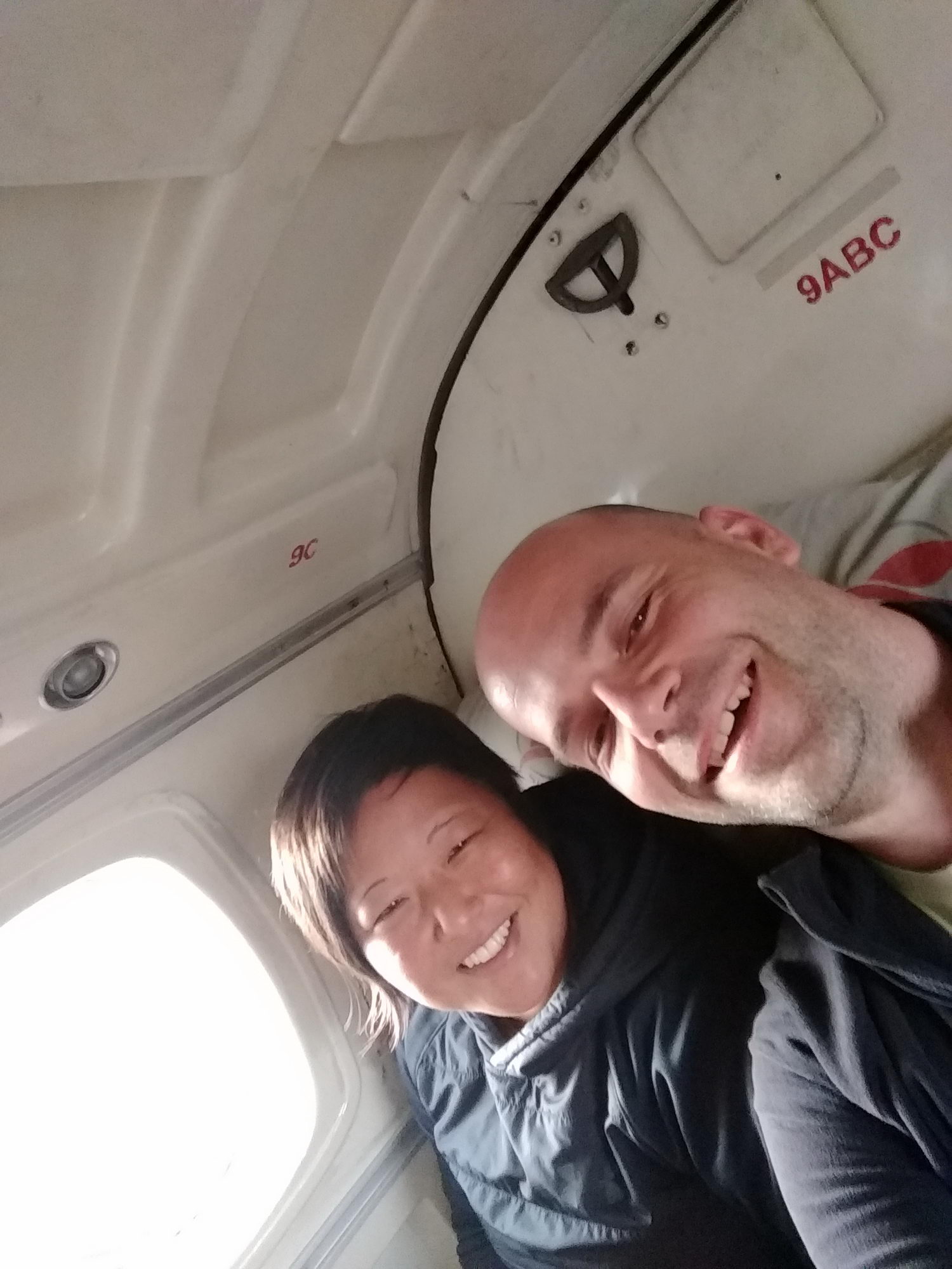 Inchecken gebeurt een uur op voorhand. De bordjes boven de incheckbalies worden gewisseld en dan is het aan ons. Bagage op de weegschaal. Wij op de weegschaal. Hehe, dat belooft!