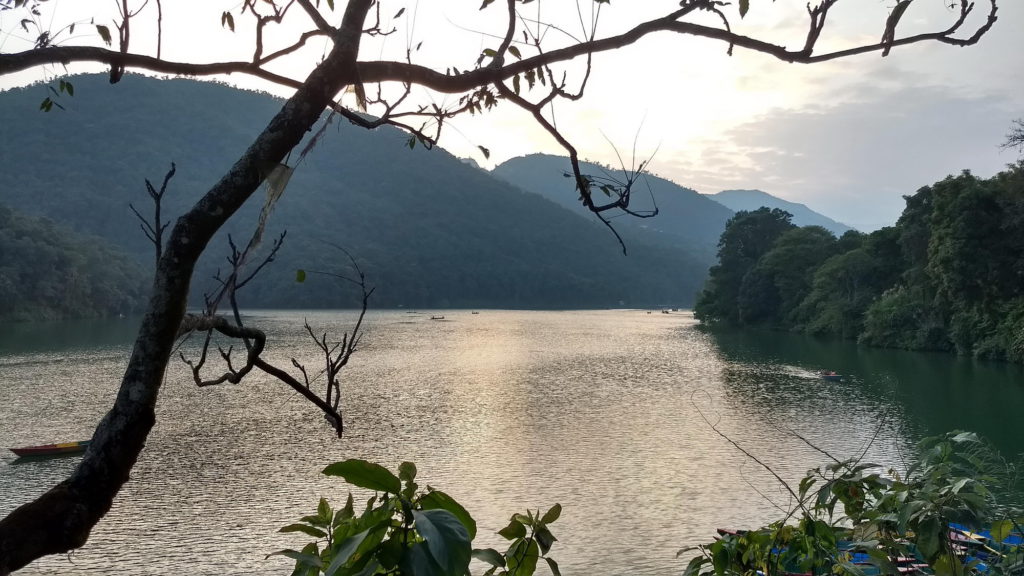 Onze kamer heeft zicht op de Annapurna I, die in de verte statig boven de rest van de bergen uitsteekt. We drinken onze thee op het terras en genieten nog even van de ondergaande zon. Na een opfrisbeurt gaan we Pokhara verkennen. Lakeside is het toeristische centrum, waar je net zoals in Kathmandu tal van hotels, guesthouses, restaurantjes, bars, winkeltjes, outdoorbedrijven, wisselkantoortjes,… Het verschil is dat het veel minder druk is dan in Kathmandu, dus eigenlijk wel een verademing. Het valt ook op dat alles net wat verzorgder en beter afgewerkt is dan in Kathmandu, toch zeker in de Lakeside regio. Pokhara heeft duidelijk baat bij de vele trekkers die hier vertoeven. En zoals Lakeside al doet vermoeden is er hier een groot meer, waar je pedalo’s en roeibootjes kan huren.