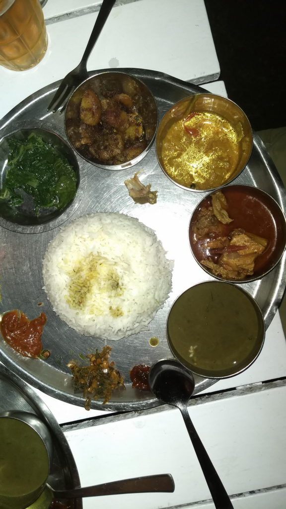 We wandelen langs de winkeltjes, die ook weer alle mogelijke namaak The North face en andere merken verkopen of tal van kleurrijke souvenirs. Fré schaft nog een warme muts aan en heeft zo zijn eerste souvenir. We laten de winkels achter ons en slaan af in klein straatje, dat ons naar het meer brengt. Langs het meer vind je heel wat gezellige bars en restaurants. Het is ondertussen donker en overal branden er gezellige lichtjes, die het nog sfeervoller maken. We genieten van een frisse pint in de Bamboo bar, maar beslissen om hier niet te eten. We gaan local eten in Thakali kitchen, een restaurant waar enkel Nepalees geserveerd werd. Lekker en goedkoop!