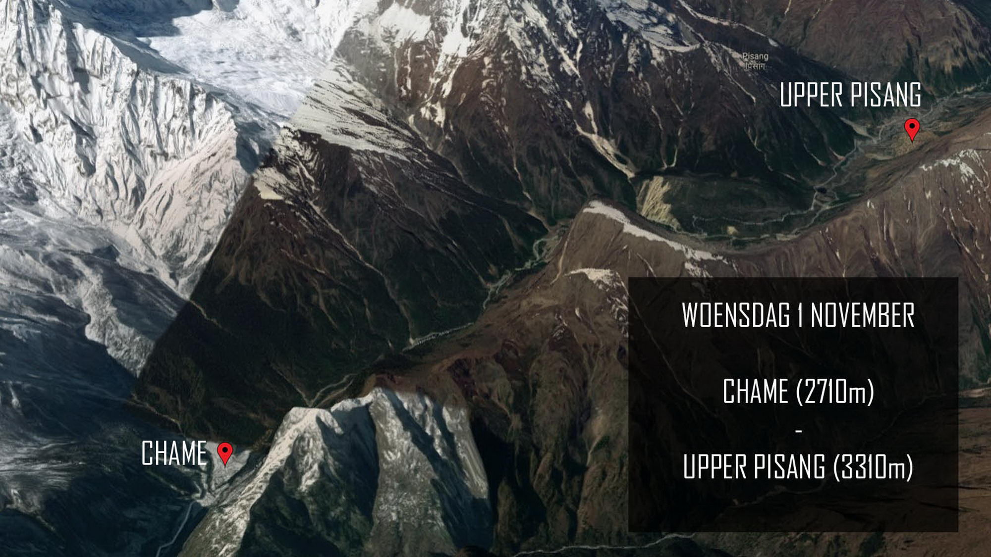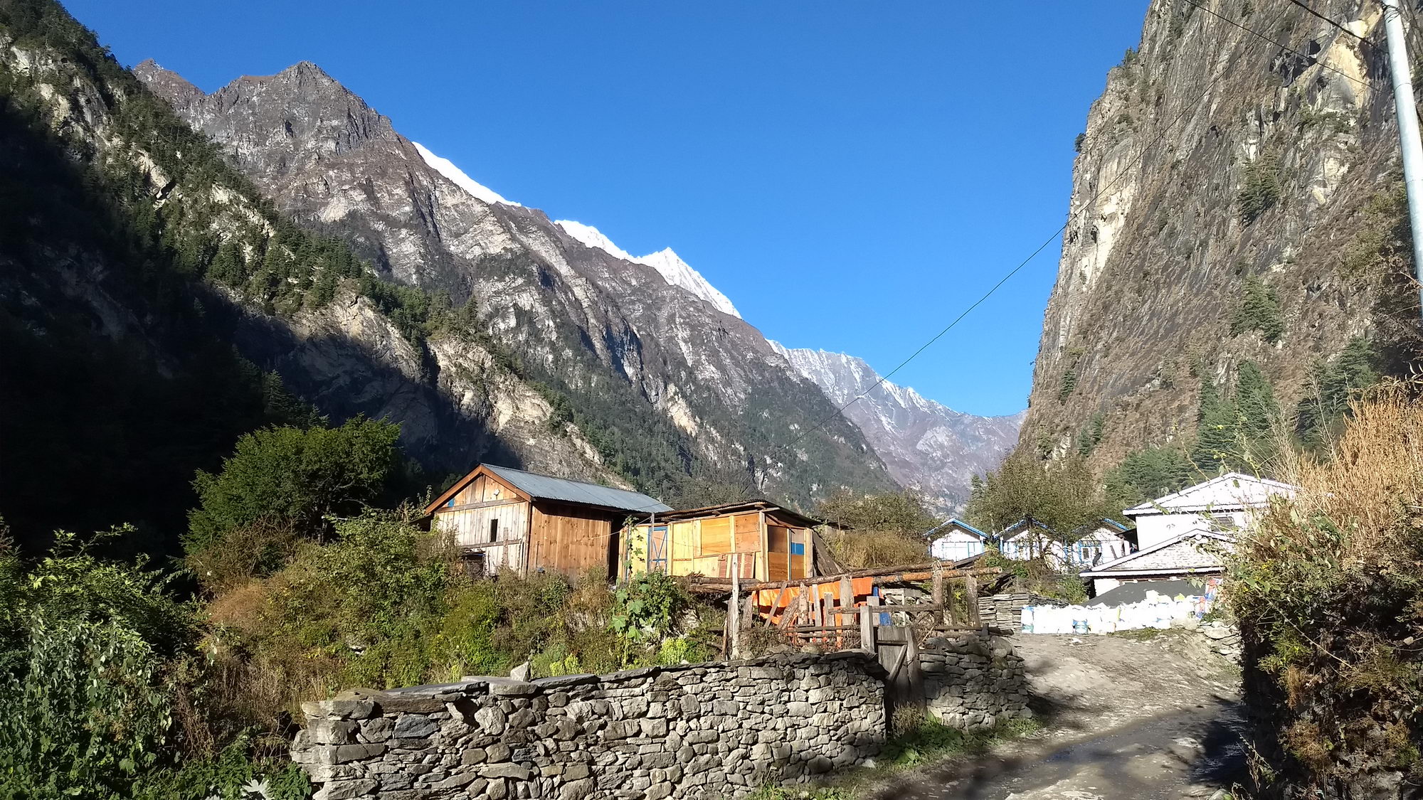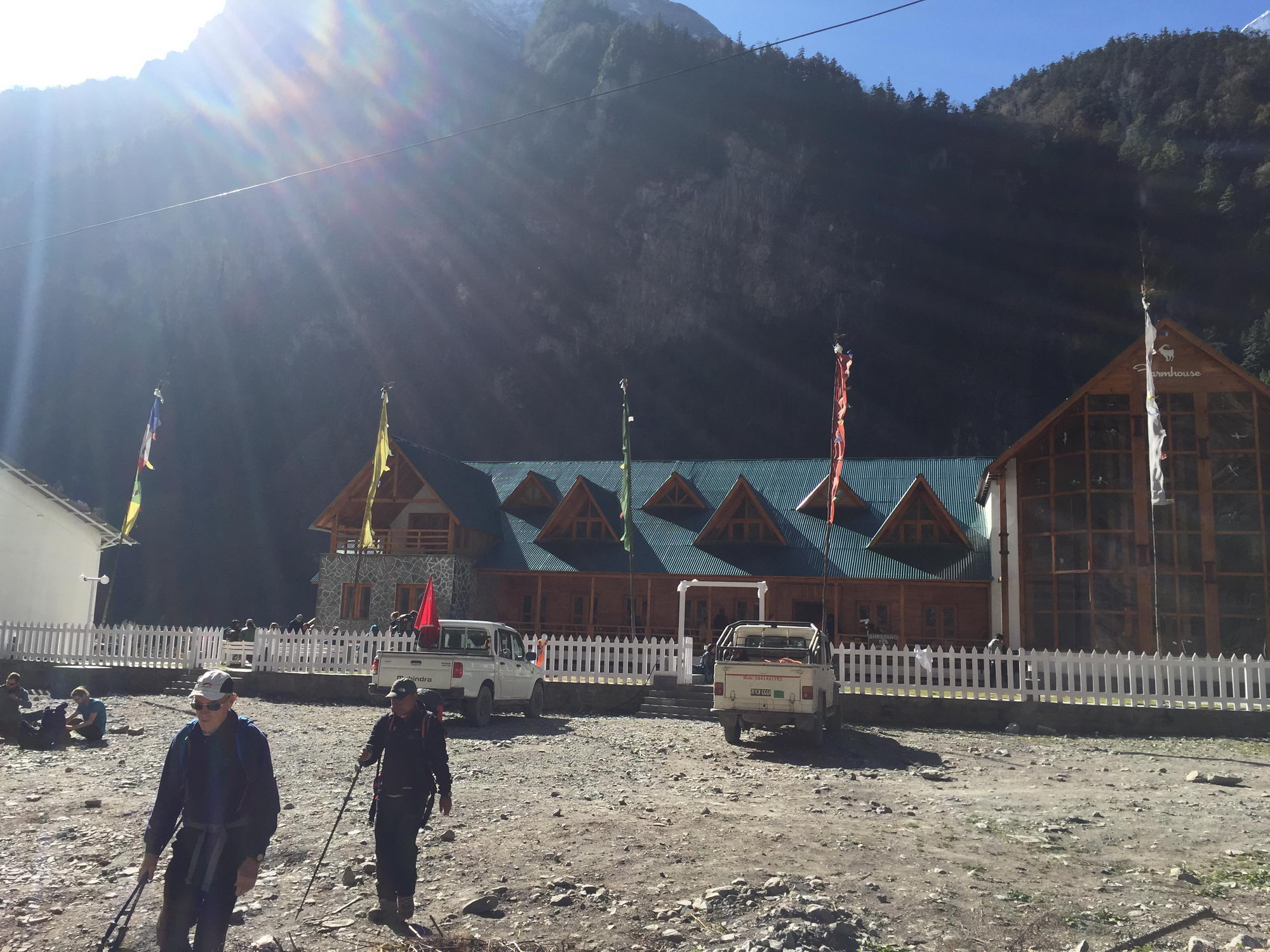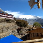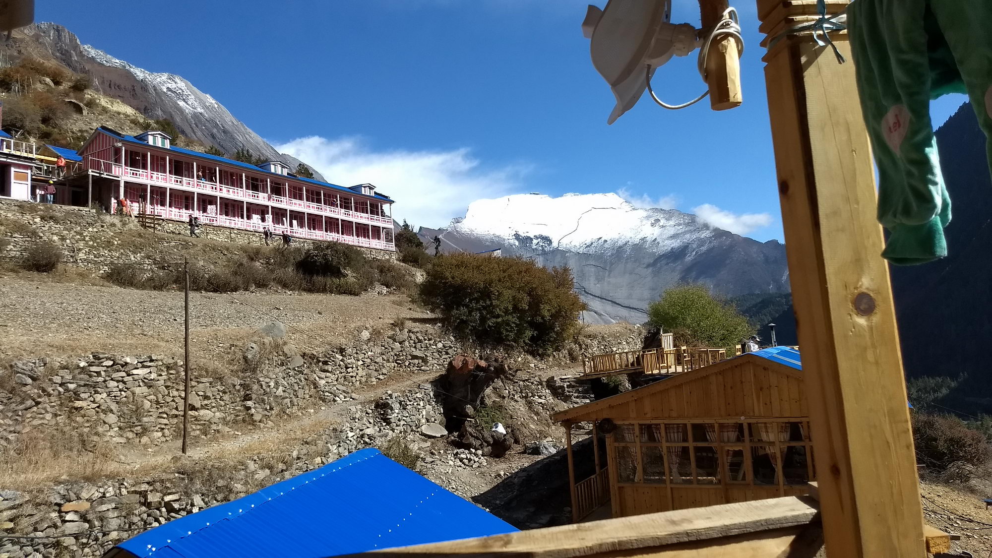 Bij het uitwandelen van het dorp kan je ofwel de weg naar Lower Pisang nemen ofwel de alternatieve trail naar Upper Pisang. Als je kan kiezen voor een alternatieve trail, moet je deze zeker overwegen, want deze gaat langs mooie paden en vermijdt de weg. We wandelden via een dorre hoogvlakte en korte klim naar Upper Pisang, het traditionele gedeelte van het dorp met machtige vergezichten. We kiezen voor de zonovergoten Royal Himalayan Lodge, een recente accommodatie met aparte houten huisjes met het fabuleuze zicht op de Annapurna 2. We komen hier rond 13 uur aan, dus tijd genoeg om te relaxen en te genieten van het zonnetje in een schitterende omgeving. Wat wil een mens nog meer?