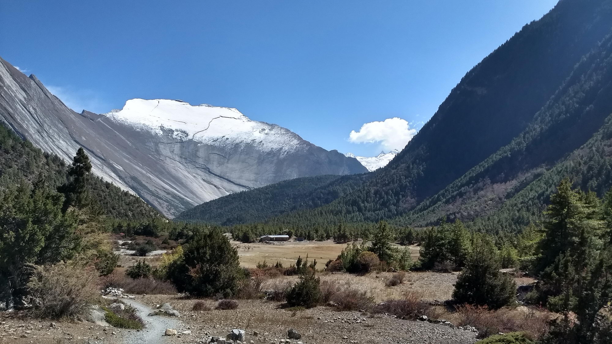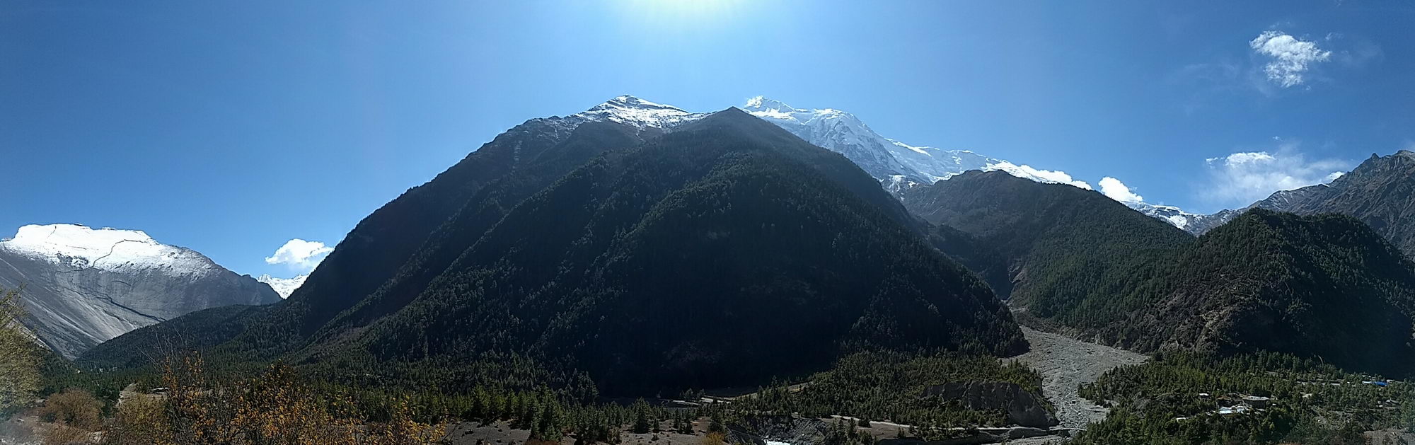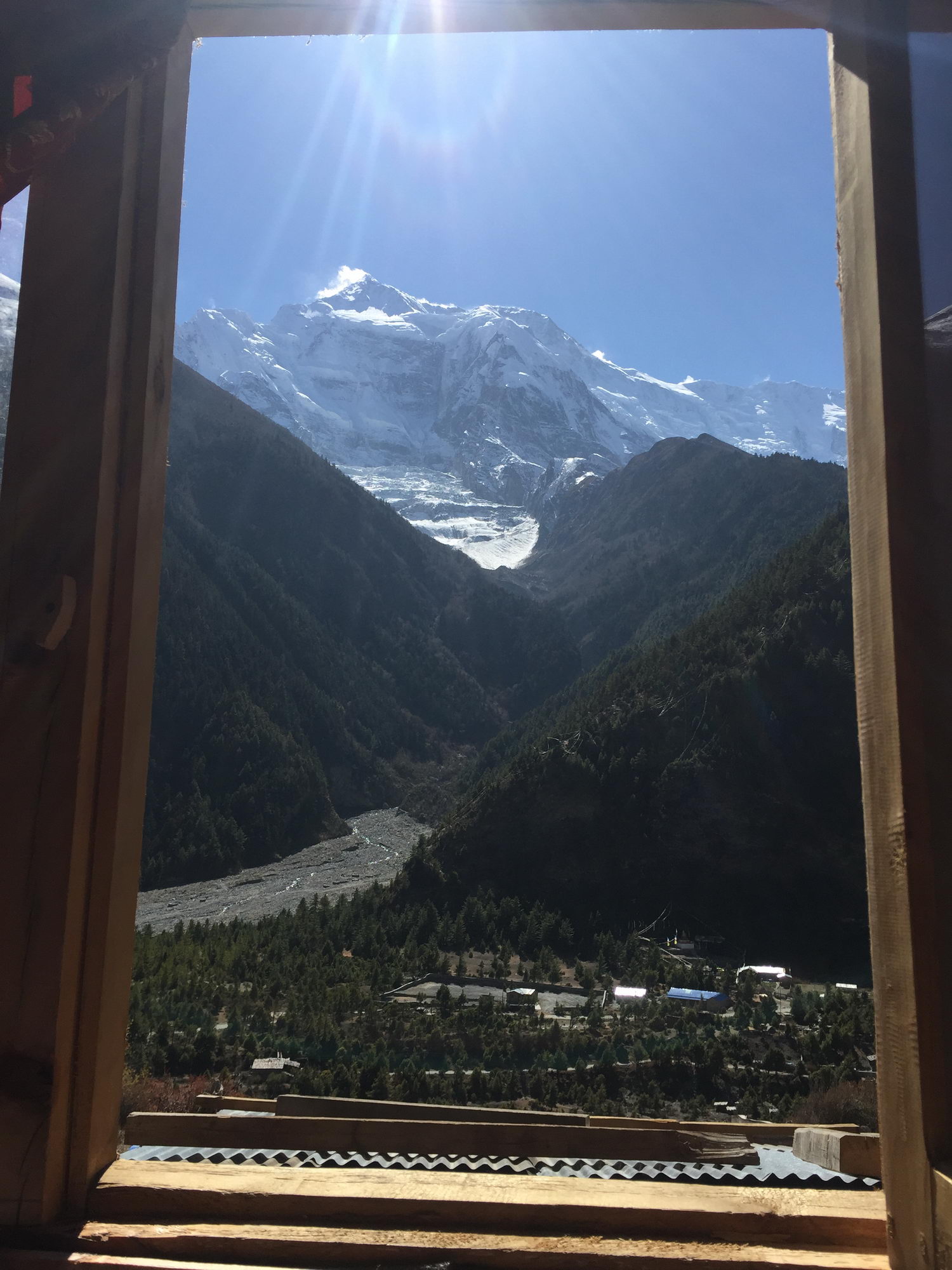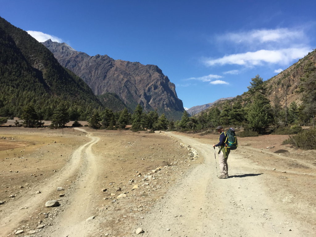 Bij het uitwandelen van het dorp kan je ofwel de weg naar Lower Pisang nemen ofwel de alternatieve trail naar Upper Pisang. Als je kan kiezen voor een alternatieve trail, moet je deze zeker overwegen, want deze gaat langs mooie paden en vermijdt de weg. We wandelden via een dorre hoogvlakte en korte klim naar Upper Pisang, het traditionele gedeelte van het dorp met machtige vergezichten. We kiezen voor de zonovergoten Royal Himalayan Lodge, een recente accommodatie met aparte houten huisjes met het fabuleuze zicht op de Annapurna 2. We komen hier rond 13 uur aan, dus tijd genoeg om te relaxen en te genieten van het zonnetje in een schitterende omgeving. Wat wil een mens nog meer?