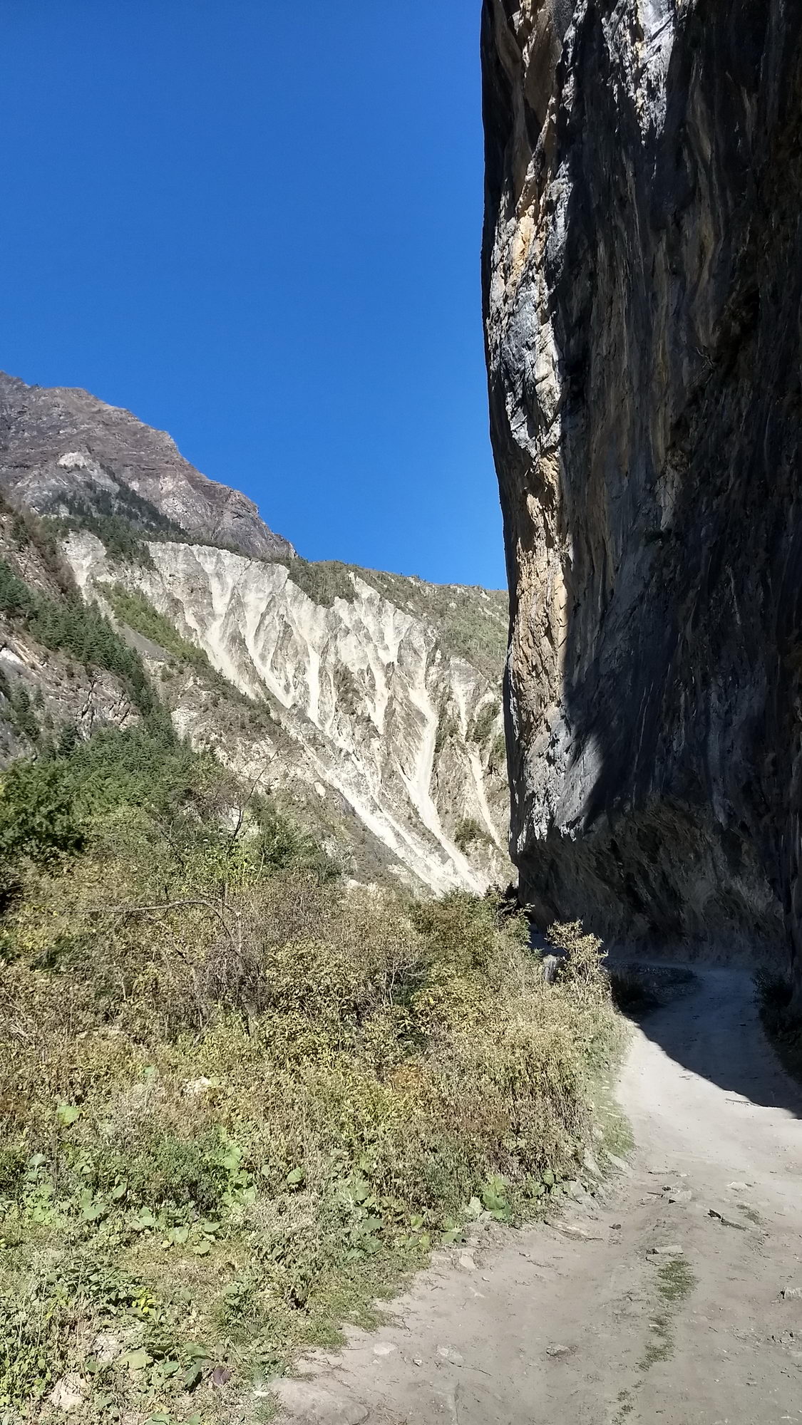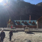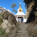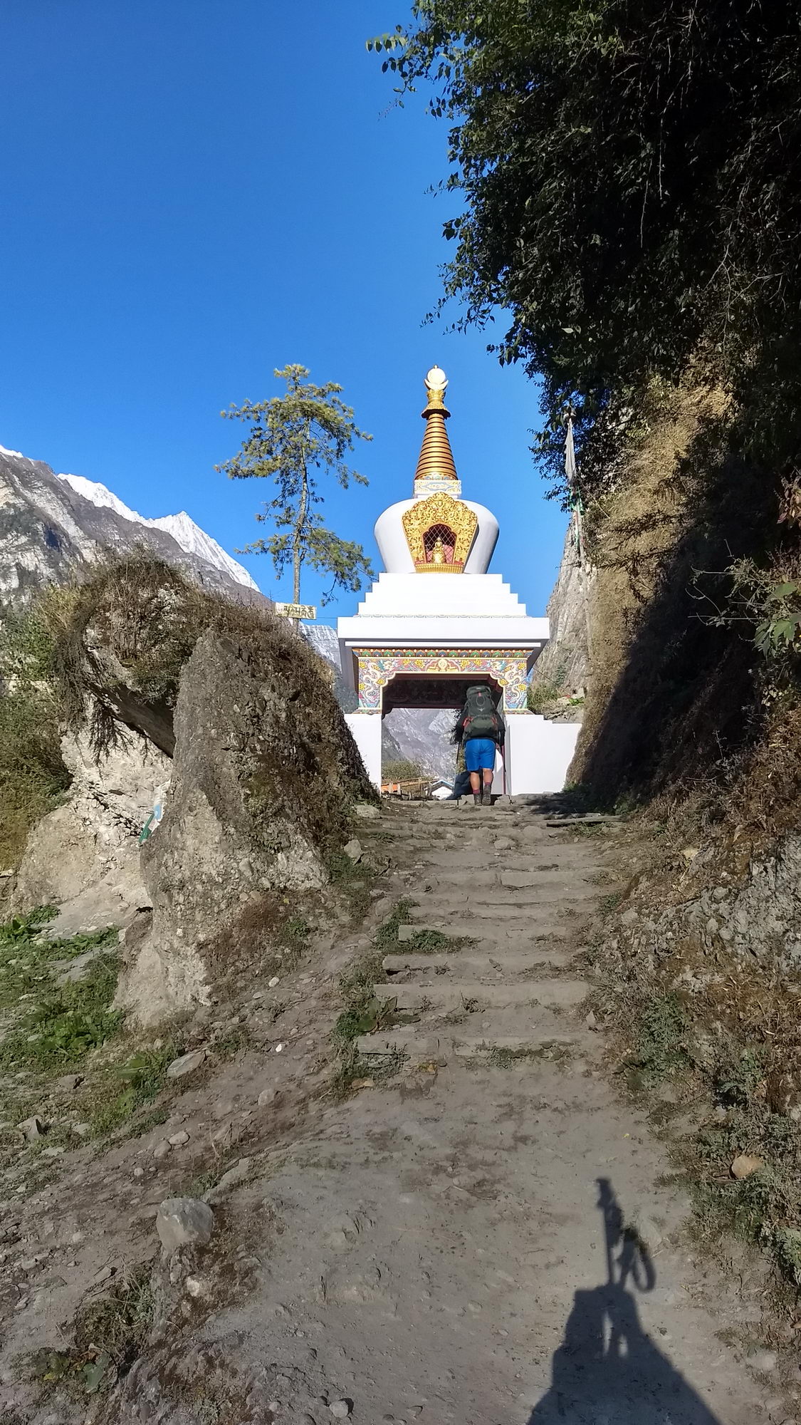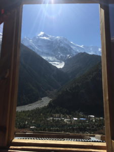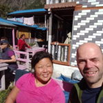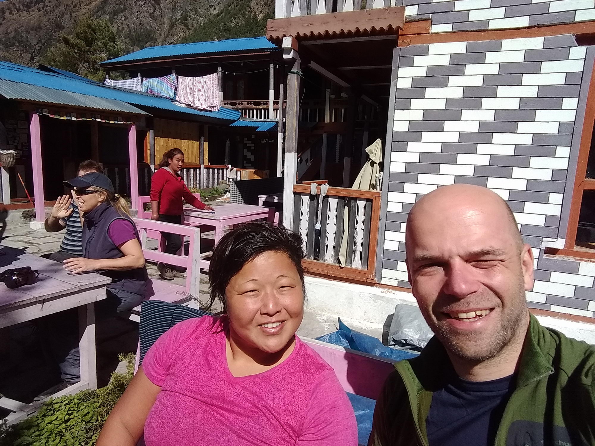 De trekking gaat langs een bosrijk gebied en appelplantages naar Bhratang, waar we een stop maken om een theetje te drinken met een verse appelmuffin die recht uit de oven komt. Mjummie… super lekker! We vervolgen onze weg via een uitgeholde klif. Achter de bocht zien we de Paungda Danda 1500 m boven de rivier uitsteken en zien we ook de Annapurna 2 voor een eerste keer in het landschap opduiken. Machtige vergezichten. Een steile klim via een tof bospad brengt ons de eerste keer boven de 3000 m. Niet te onderschatten met een rugzak van 11 kg op je rug. Het enige wat je kan doen is het tempo wat aanpassen zodat je lichaam de inspanning makkelijker verteert. Tussenin kom je een paar stalletjes tegen, die wat te eten en drinken verkopen en wat leuke armbanden en halskettingen. Ik laat mij verleiden tot een leuke halsketting. Meteen ook mijn eerste souvenir. Hier komen we ook onze jeep reisgenoten terug tegen. Na een korte pauze en ervaringen uitwisselen gaan we verder bergop door het bos. We hebben onze tweede adem gevonden! Eénmaal boven wandel je opnieuw via de weg naar Dhukur Pokhari, waar wij onze lunchpauze namen op het terras van een van de kleurrijke lodges. Noedelsoep en thee onder een stralende zon! Zaaaalig!