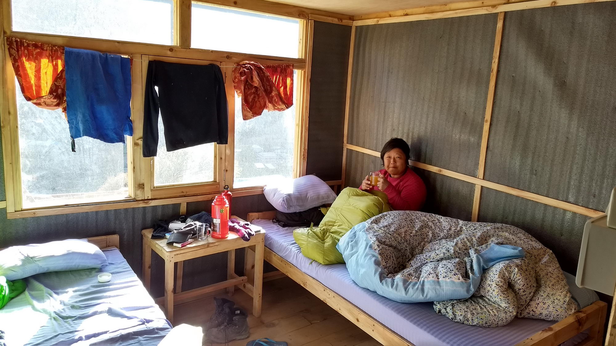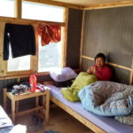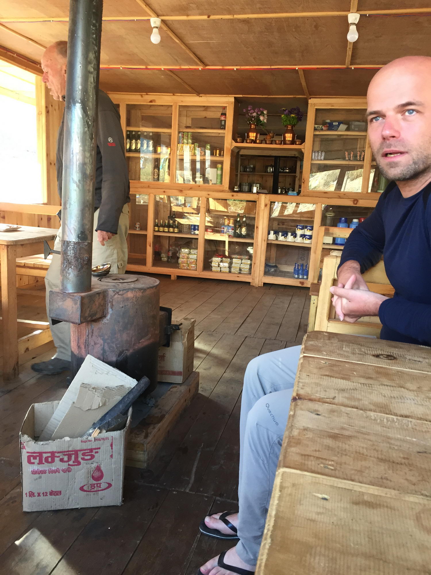 Acclimatisatie is vanaf deze hoogte zeer belangrijk. Dat hebben we ook aan de lijve ondervonden. Na een uur of vier op 3300 m had ons lijf er plots genoeg van. Tijd om even horizontaal te gaan en wat te slapen. Dit bleek verkwikkend te werken. Onze maag begon te rammelen. Als voorafje bestelden we looksoep. Dit zou goed zijn om hoogteziekte te voorkomen, maar smaken deed het niet. Fré koos voor gebakken aardappelen met tonijn uit blik, een enorme portie maar niet echt een topgerecht. Ik was blij met mijn keuze: aardappelpuree met yak kaas en melk.