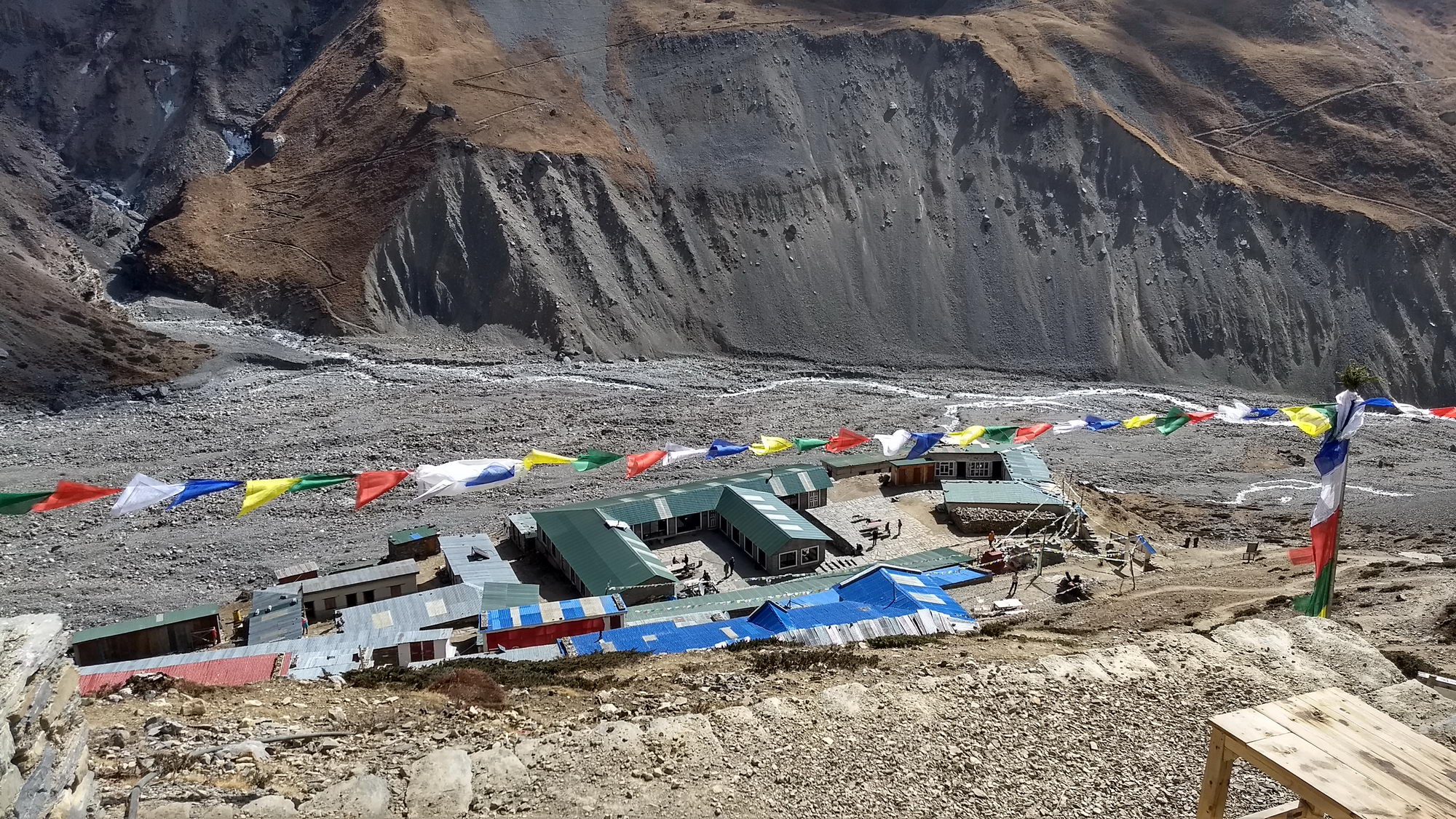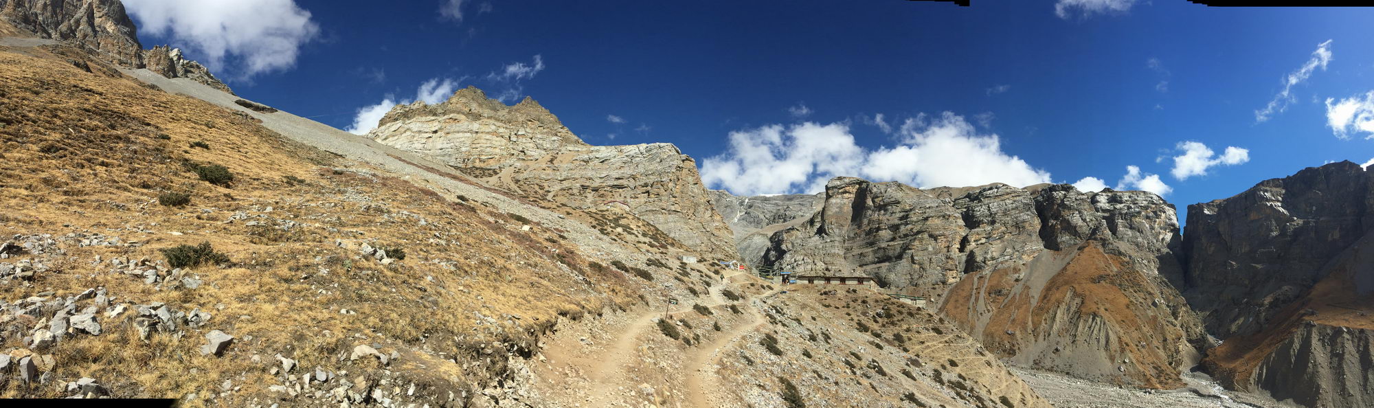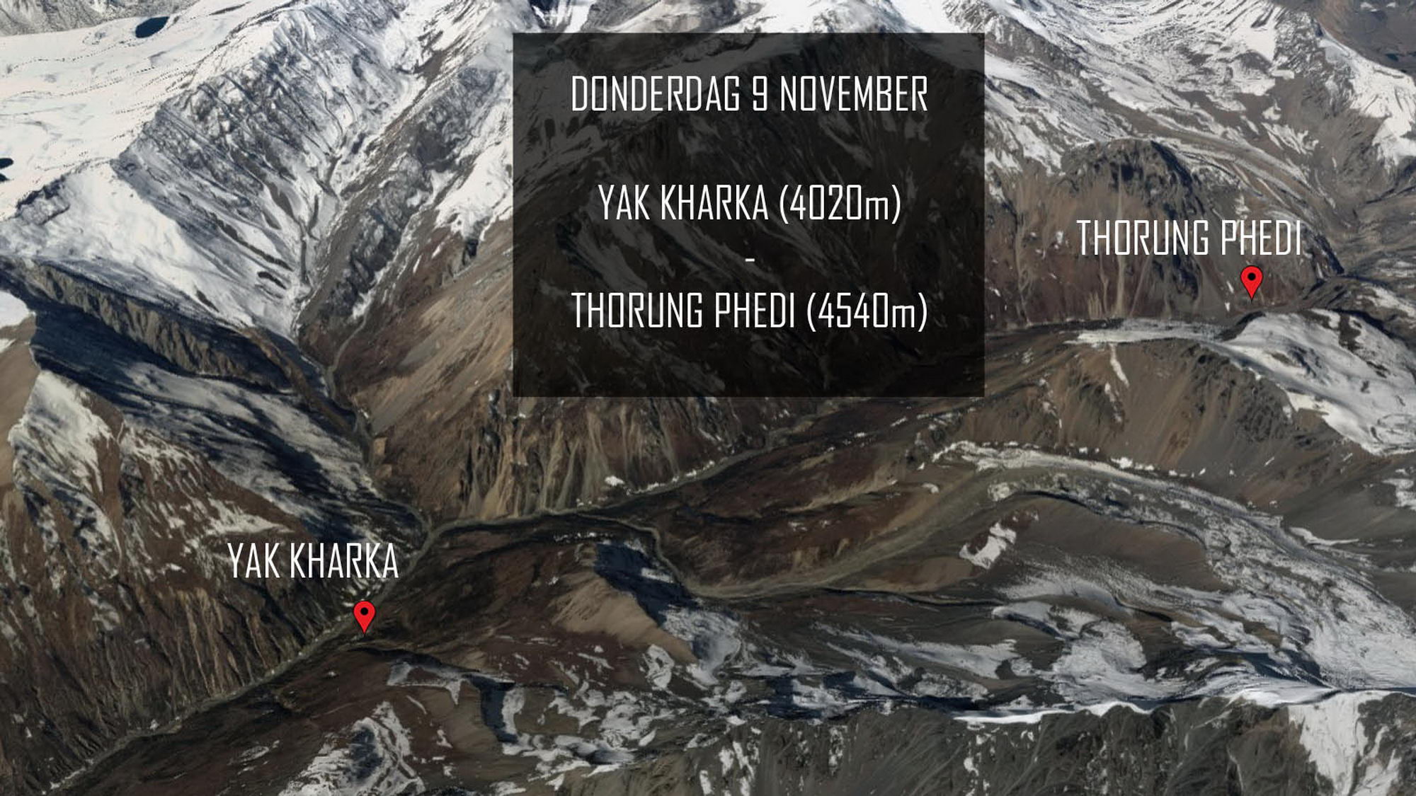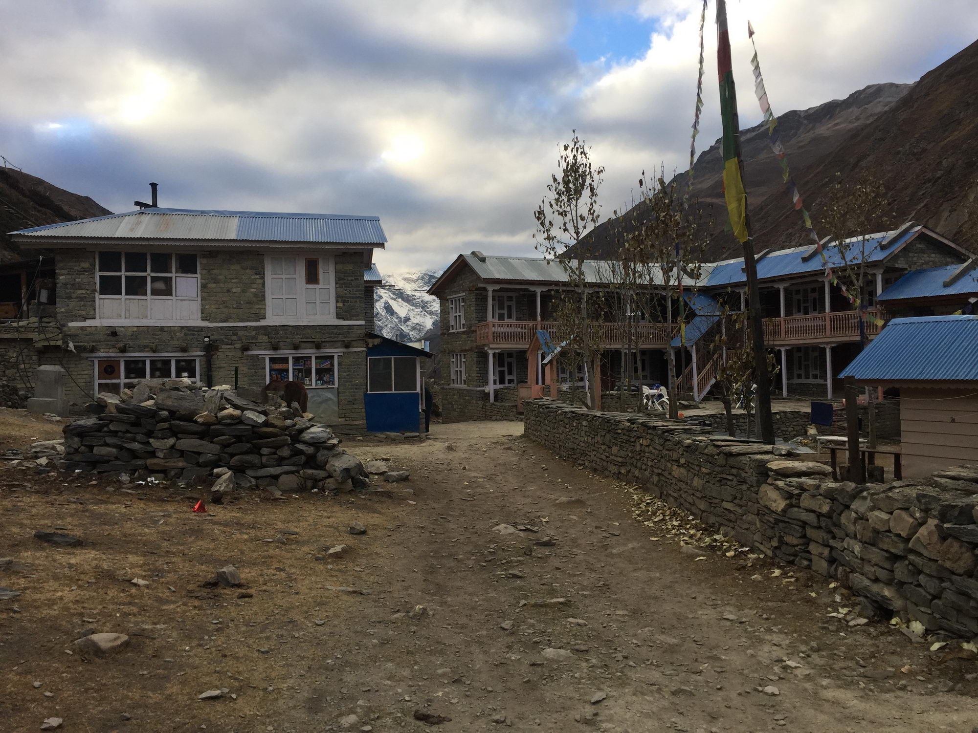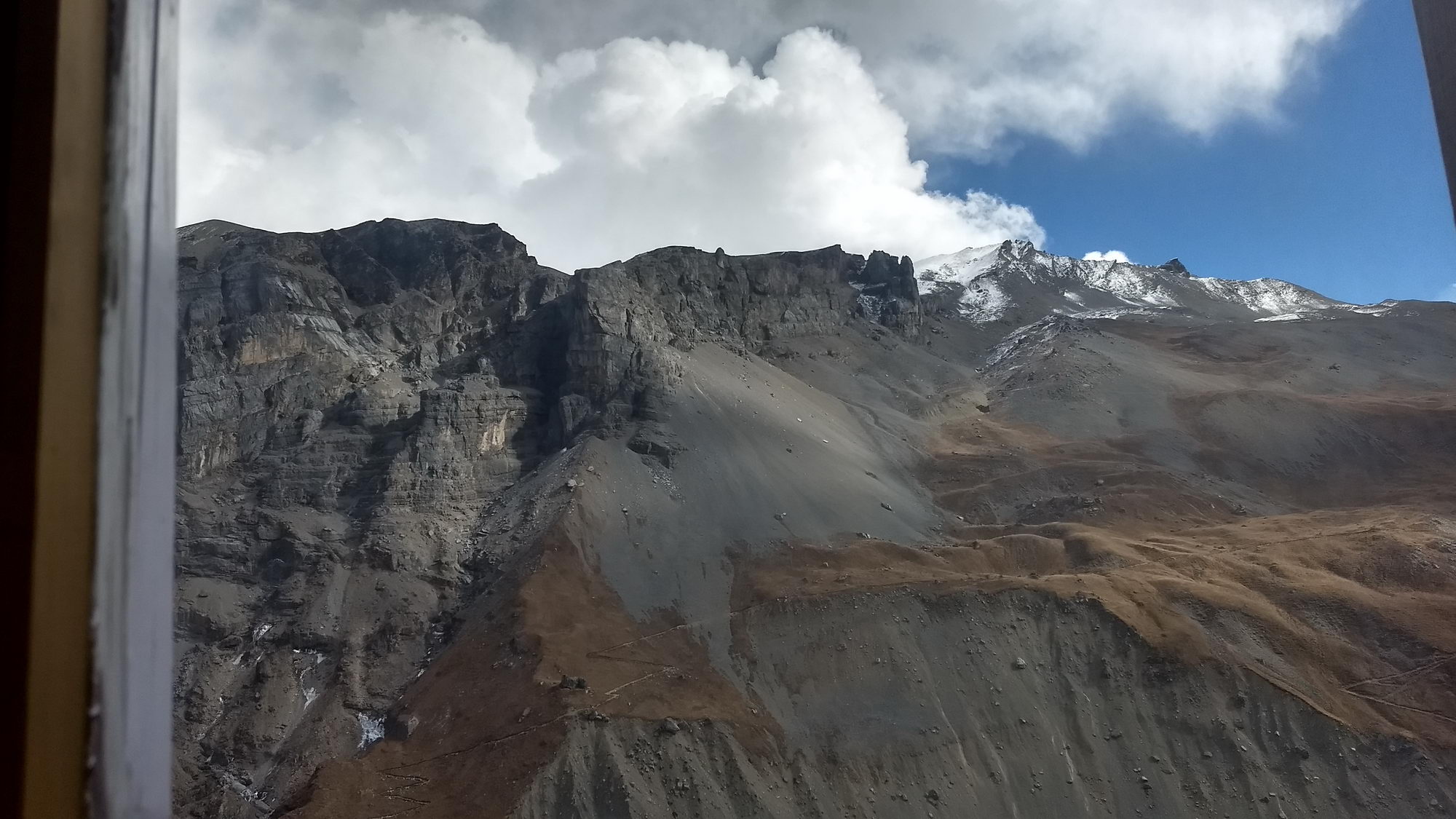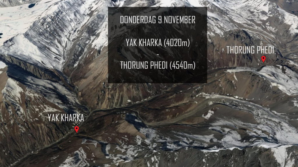 Eindelijk gaat de wekker en starten we ons zoveelste ochtendritueel. Om 7 uur zijn we vertrokken. We zitten hier wel op 4020 m, maar ik moet om de 5 stappen stoppen om uit te blazen en om hoestbuien te verwerken wat de voorbije dagen het geval niet was. Dit betekent niet veel goeds. De trend voor de rest van de etappe is gezet. Beetje bij beetje schieten we op, op een vrij vlakke route. Door bijna voortdurend te hyperventileren kan ik mij tot na de steilste klim voortsleuren in het zog van Fré, die mij op sleeptouw neemt. Gelukkig, want anders ging ik mij op mijn gat zetten en zou ik geen meter meer verzetten. Het wordt opnieuw minder steil en het laatste stuk leggen we tergend langzaam af. Er leek geen einde aan te komen. Plots duikt Thorung Phedi in de verte op. Je kan hier ‘beneden’ overnachten ofwel iets hoger. We besloten, op mijn aandringen, om de hoogst gelegen lodge te nemen zodat we morgen minder moeten klimmen. De New Top Hill hotel is een eenvoudige lodge met een gezellige diner en kleine, maar comfortabele kamers. We kiezen er nu toch voor om zo dicht mogelijk te slapen bij de diner, want het is hier vrij koud. De kamers buiten voelen een stuk frisser aan.