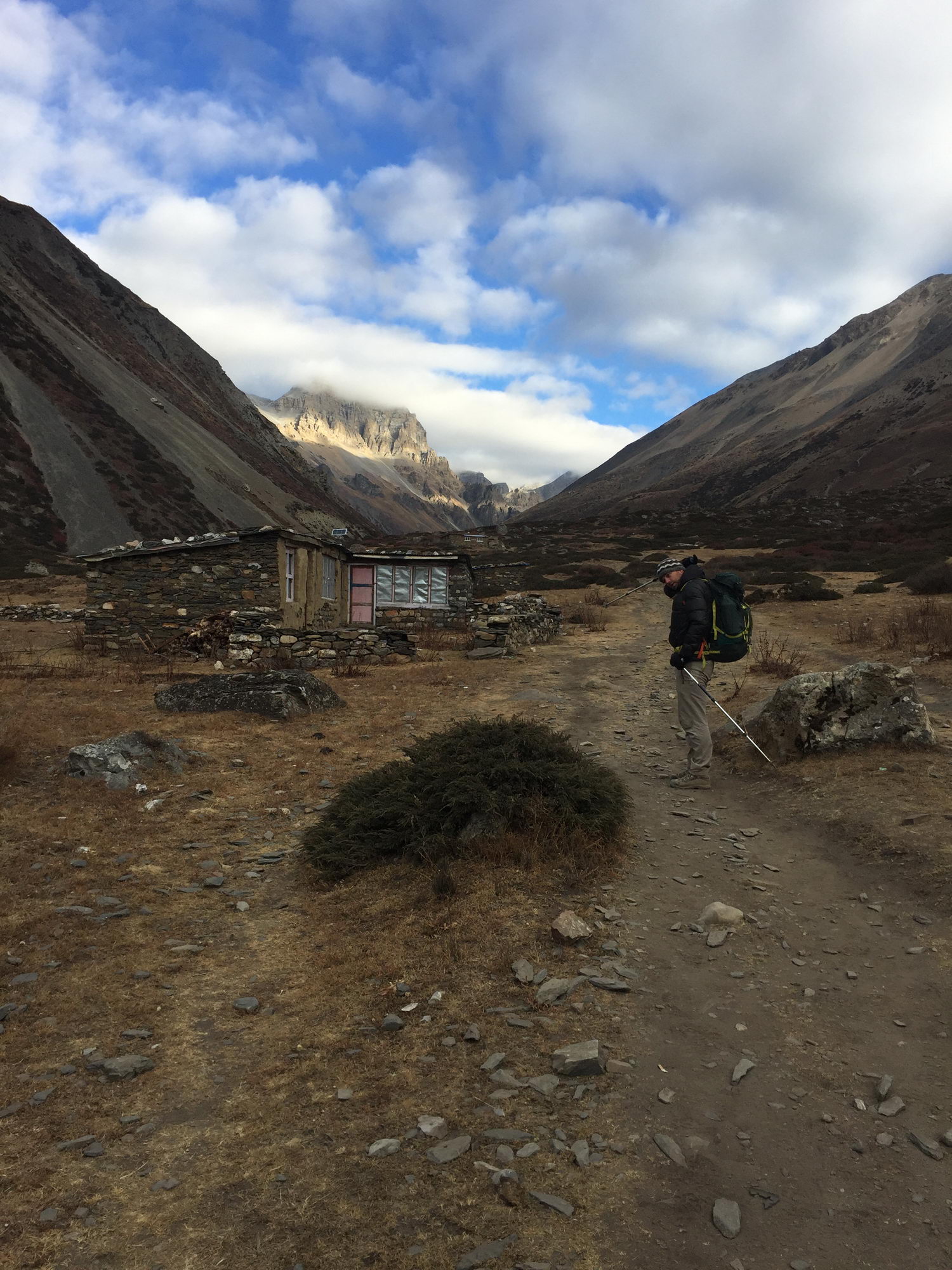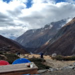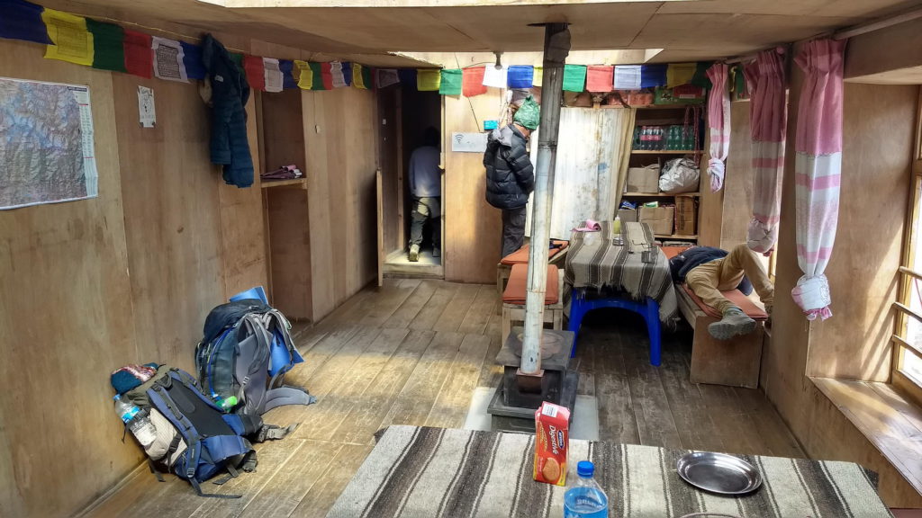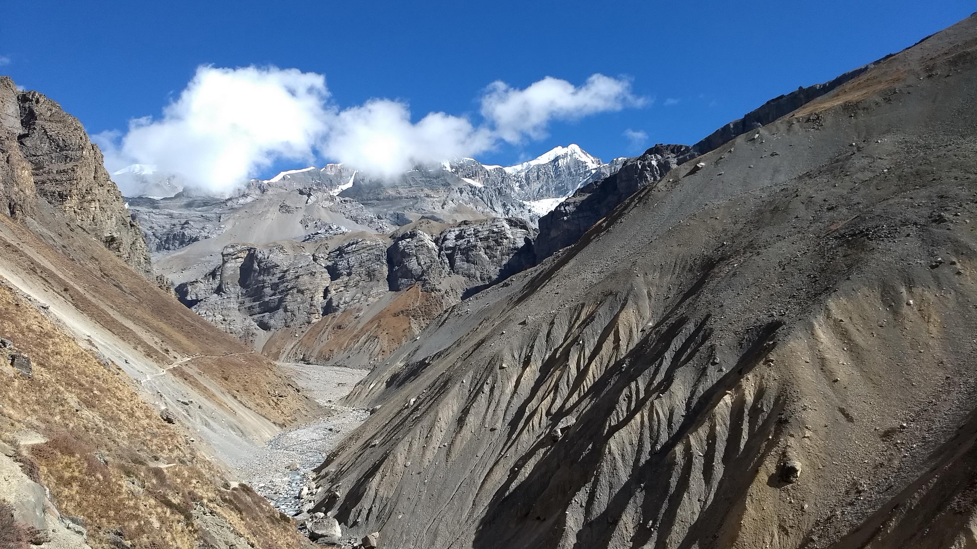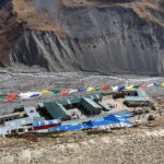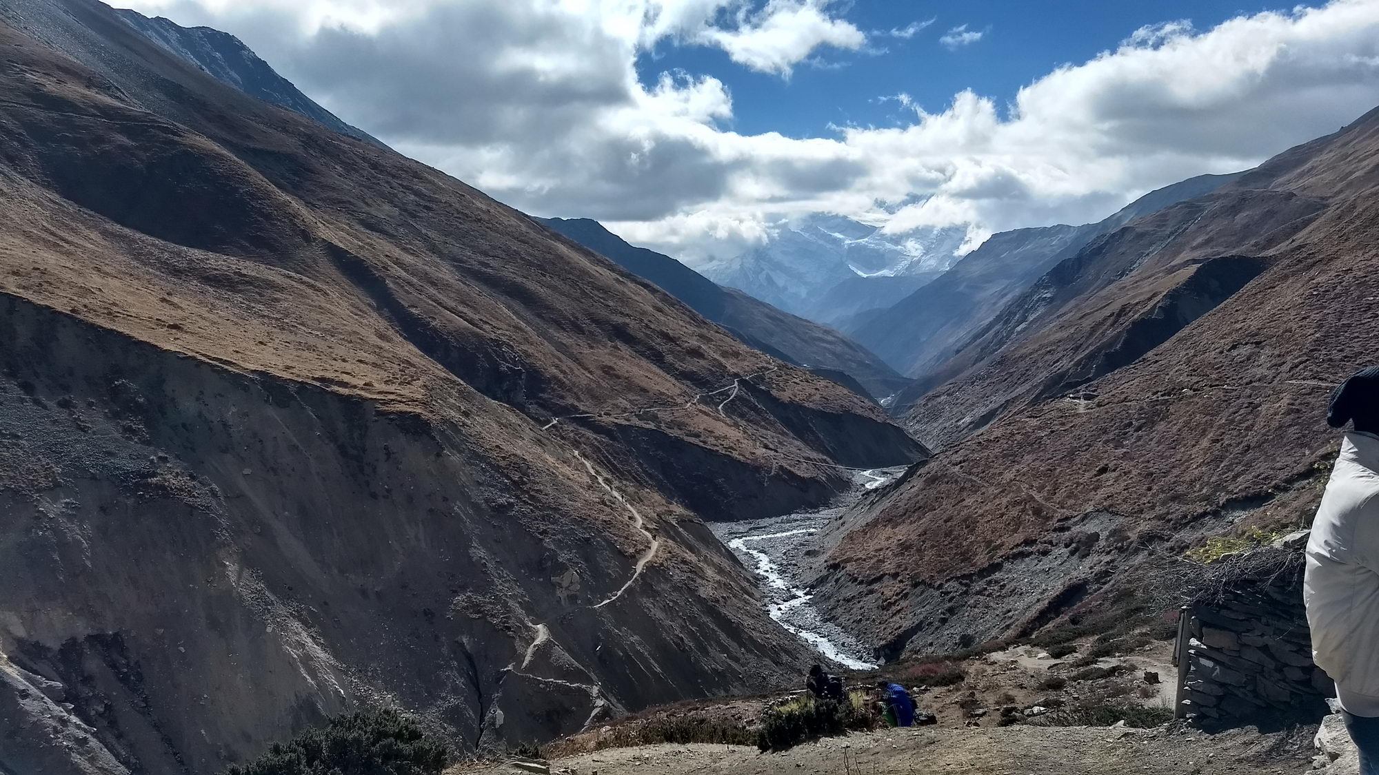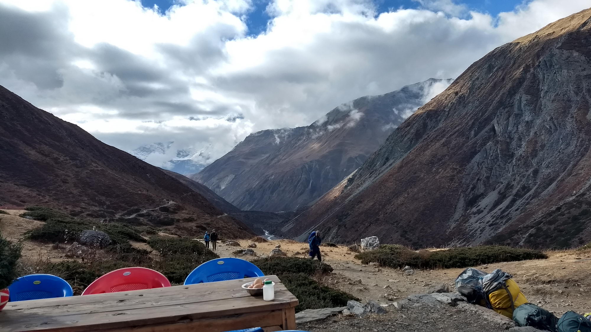 Eindelijk gaat de wekker en starten we ons zoveelste ochtendritueel. Om 7 uur zijn we vertrokken. We zitten hier wel op 4020 m, maar ik moet om de 5 stappen stoppen om uit te blazen en om hoestbuien te verwerken wat de voorbije dagen het geval niet was. Dit betekent niet veel goeds. De trend voor de rest van de etappe is gezet. Beetje bij beetje schieten we op, op een vrij vlakke route. Door bijna voortdurend te hyperventileren kan ik mij tot na de steilste klim voortsleuren in het zog van Fré, die mij op sleeptouw neemt. Gelukkig, want anders ging ik mij op mijn gat zetten en zou ik geen meter meer verzetten. Het wordt opnieuw minder steil en het laatste stuk leggen we tergend langzaam af. Er leek geen einde aan te komen. Plots duikt Thorung Phedi in de verte op. Je kan hier ‘beneden’ overnachten ofwel iets hoger. We besloten, op mijn aandringen, om de hoogst gelegen lodge te nemen zodat we morgen minder moeten klimmen. De New Top Hill hotel is een eenvoudige lodge met een gezellige diner en kleine, maar comfortabele kamers. We kiezen er nu toch voor om zo dicht mogelijk te slapen bij de diner, want het is hier vrij koud. De kamers buiten voelen een stuk frisser aan.