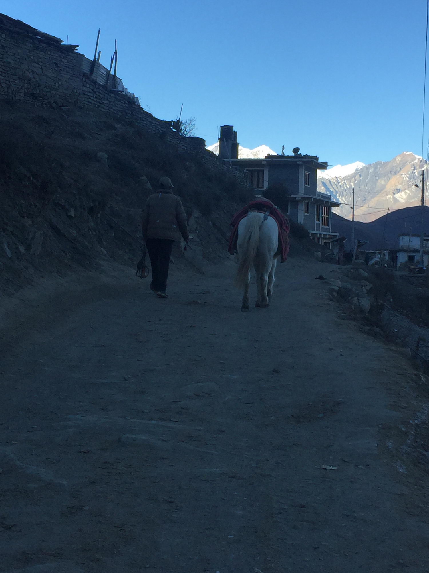 Fré was zich gisterenavond al gaan informeren aan het busstation. Vanaf 8 uur vertrekt er een toeristenbus naar Jomsom, maar dit kan ook later zijn of zelfs helemaal niet. Hangt ervan af of ze een bus vol krijgen met toeristen. De bussen naar Pokhara vertrekken rond 11 uur in Jomsom, dus het zou fijn zijn als we rond 8 u zouden kunnen vertrekken. In Nepal moet je tijd met een korreltje zout nemen, iets waar je na verloop van tijd aan went.