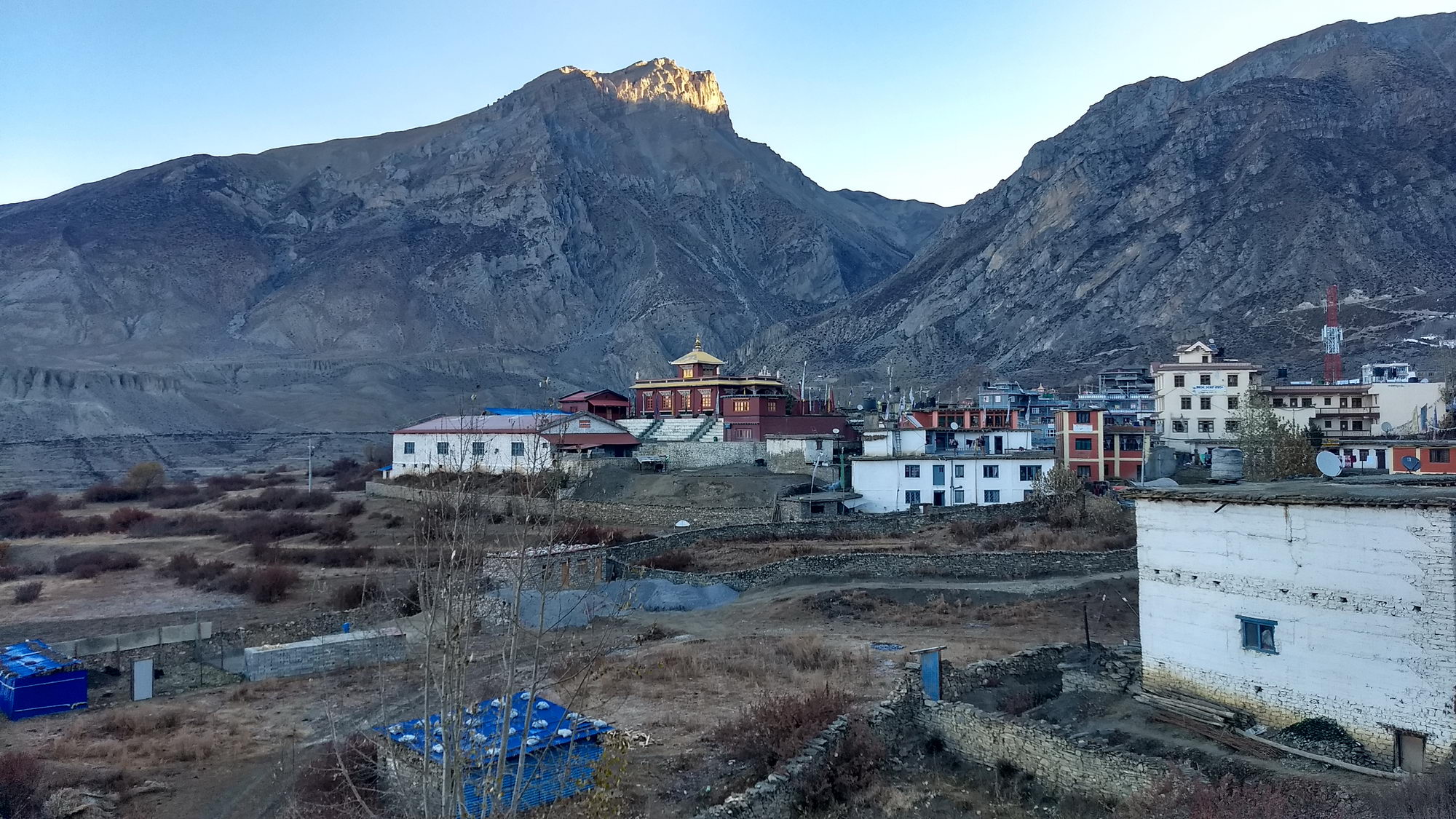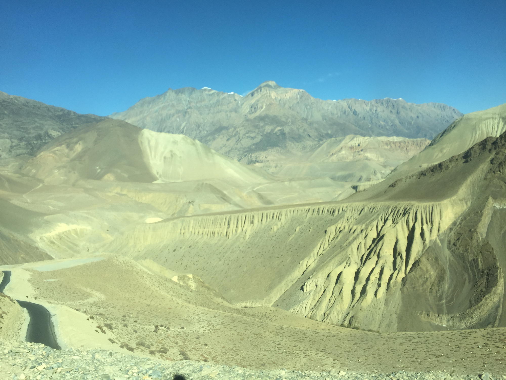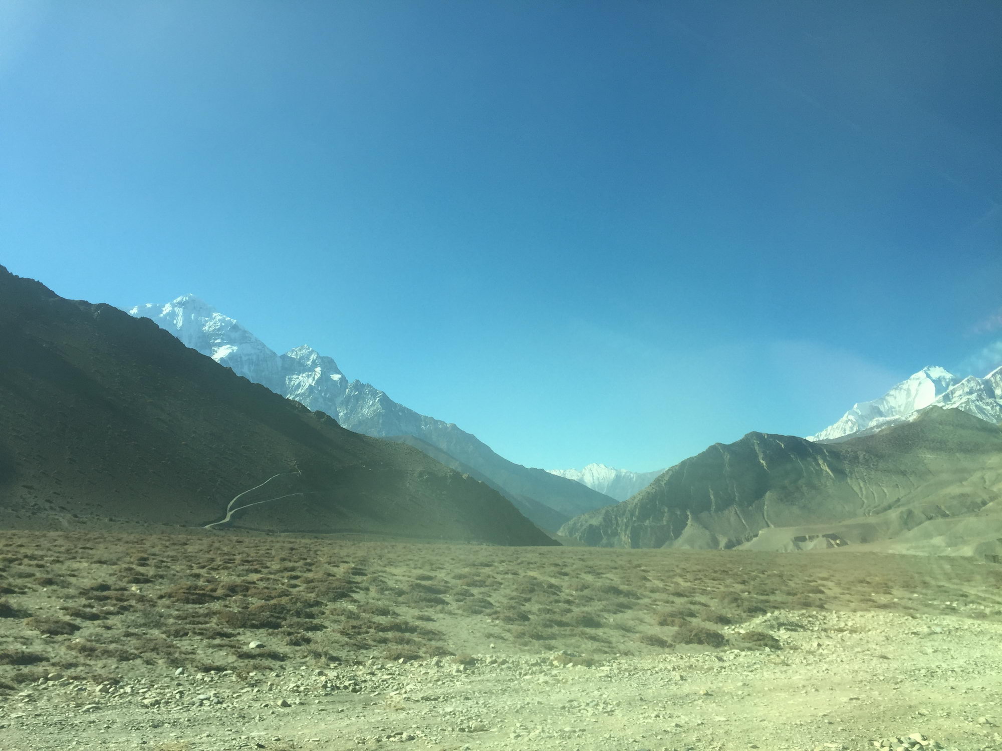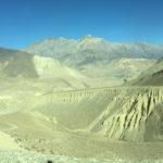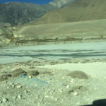 Rond 9.30 uur komt de bus er eindelijk aan en we vertrekken bijna onmiddellijk, dus waarschijnlijk halen we onze bus nog naar Pokhara! Het eerste half uur van de rit rijdt de bus heel goed door, want er ligt gloednieuwe asfalt…die plots ophoudt. Daarna gaat het bergaf naar Kagbeni via een stoffige weg vol putten en bulten, zoals we ze hier gewoon zijn. De inwoners van Kagbeni en de 12 omliggende dorpen zijn van Tibetaanse afkomst. Het ziet er een vruchtbaar gebied uit, want overal zie je akkers die in bloei staan. Het zicht is hier ook weer prachtig. Een stenige vallei met kronkelende waterlopen en in de verte de Annapurna 1. Eénmaal beneden in de vallei zie je in de verte Jomsom liggen.