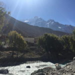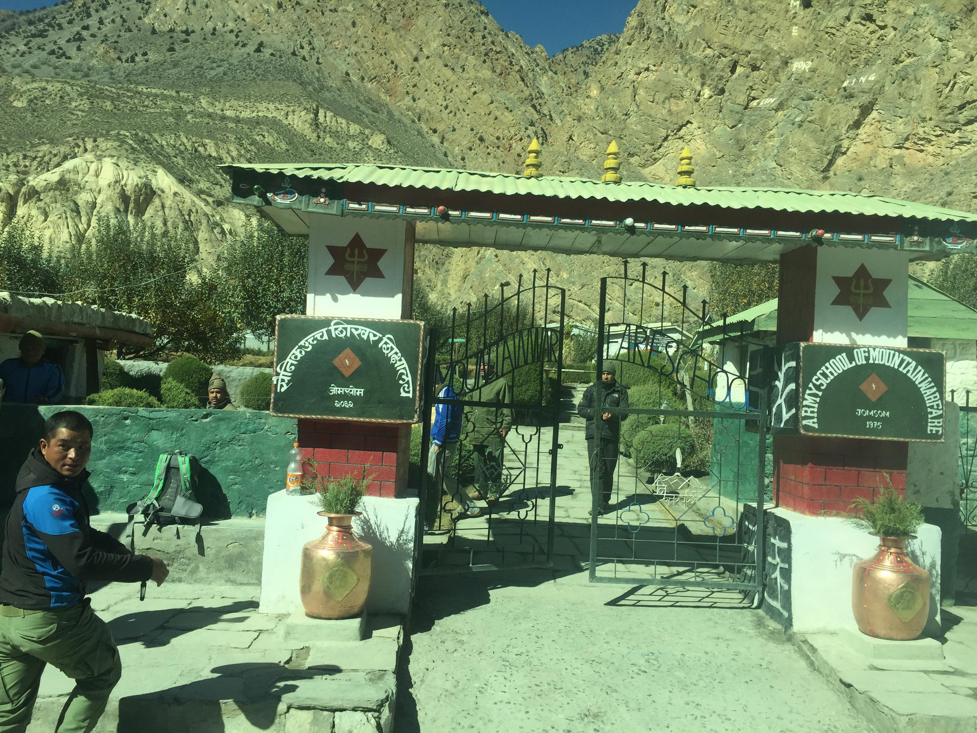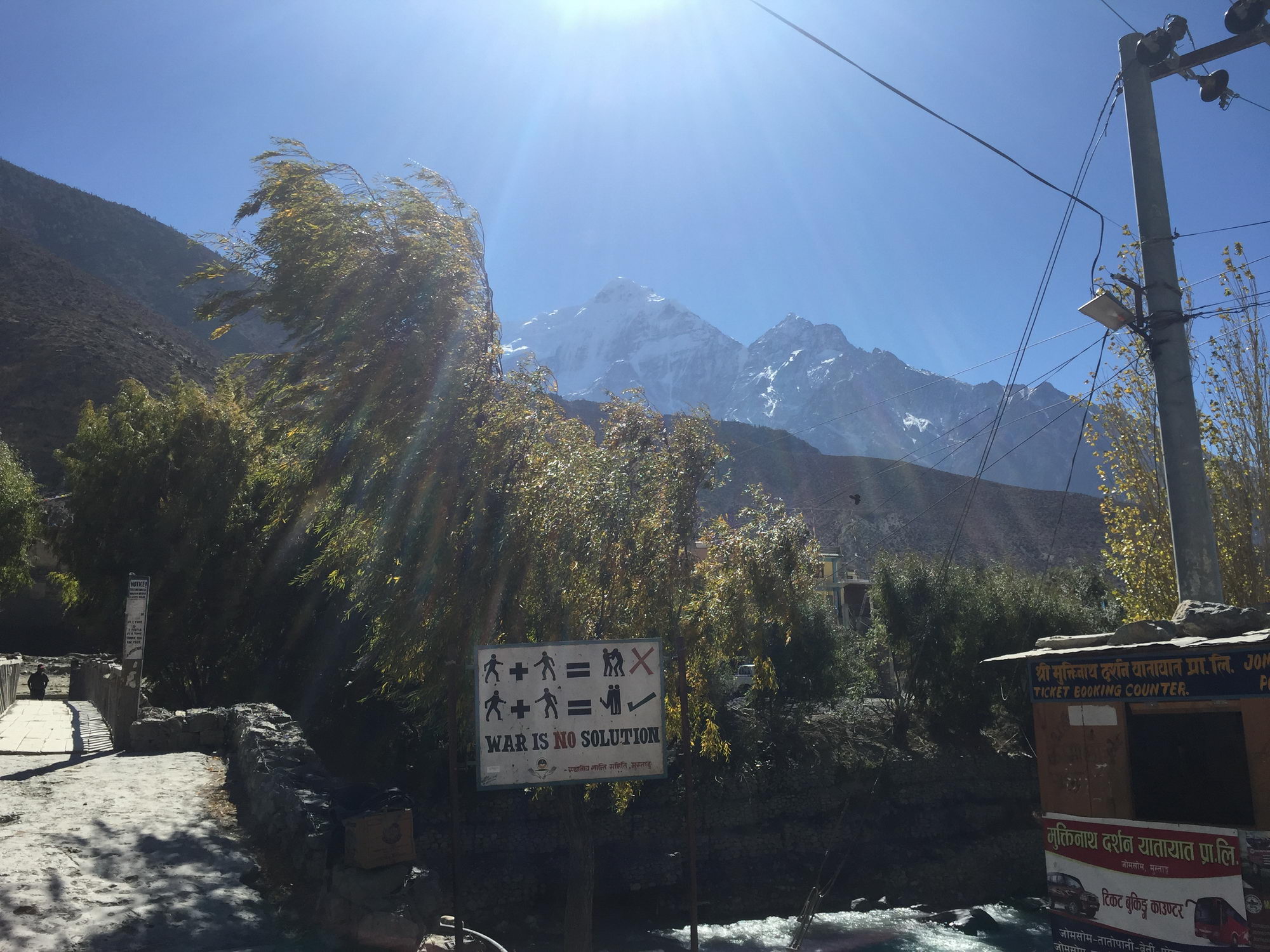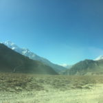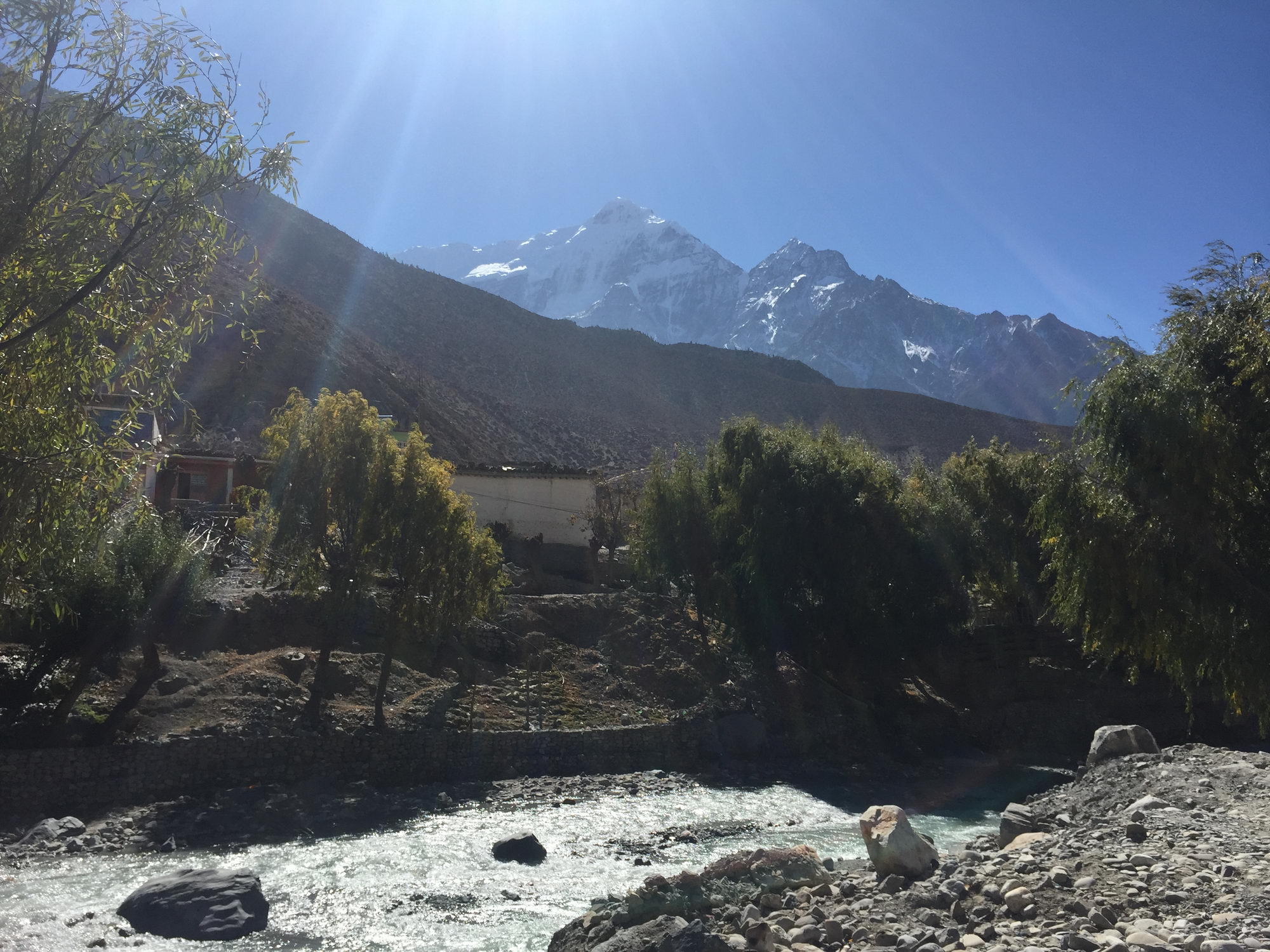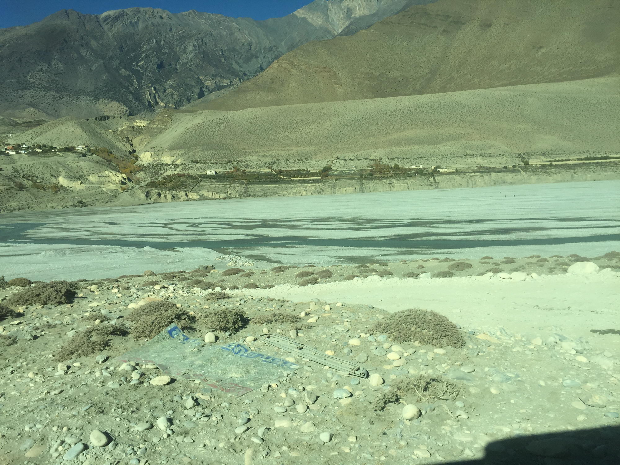 Rond 9.30 uur komt de bus er eindelijk aan en we vertrekken bijna onmiddellijk, dus waarschijnlijk halen we onze bus nog naar Pokhara! Het eerste half uur van de rit rijdt de bus heel goed door, want er ligt gloednieuwe asfalt…die plots ophoudt. Daarna gaat het bergaf naar Kagbeni via een stoffige weg vol putten en bulten, zoals we ze hier gewoon zijn. De inwoners van Kagbeni en de 12 omliggende dorpen zijn van Tibetaanse afkomst. Het ziet er een vruchtbaar gebied uit, want overal zie je akkers die in bloei staan. Het zicht is hier ook weer prachtig. Een stenige vallei met kronkelende waterlopen en in de verte de Annapurna 1. Eénmaal beneden in de vallei zie je in de verte Jomsom liggen.