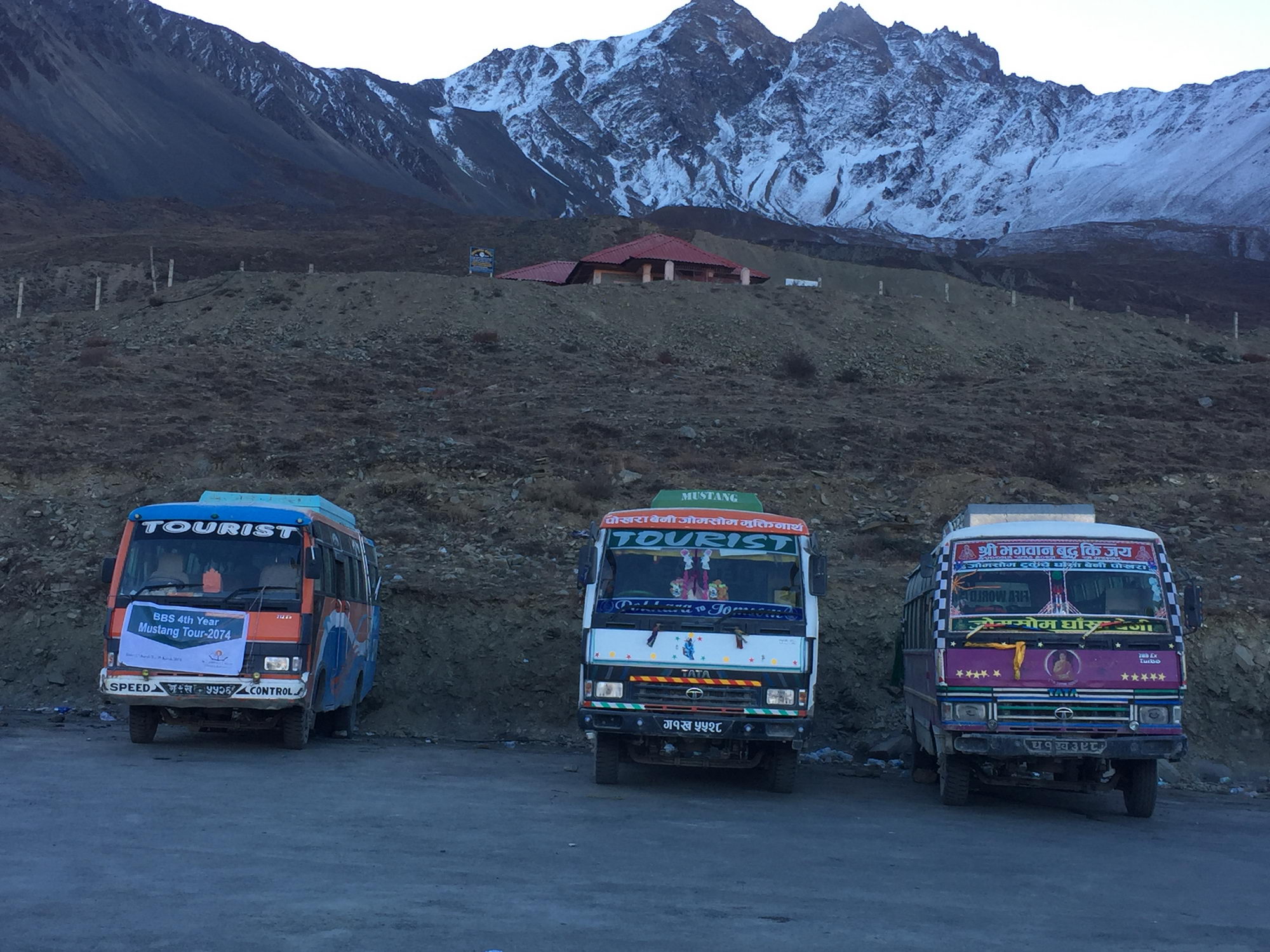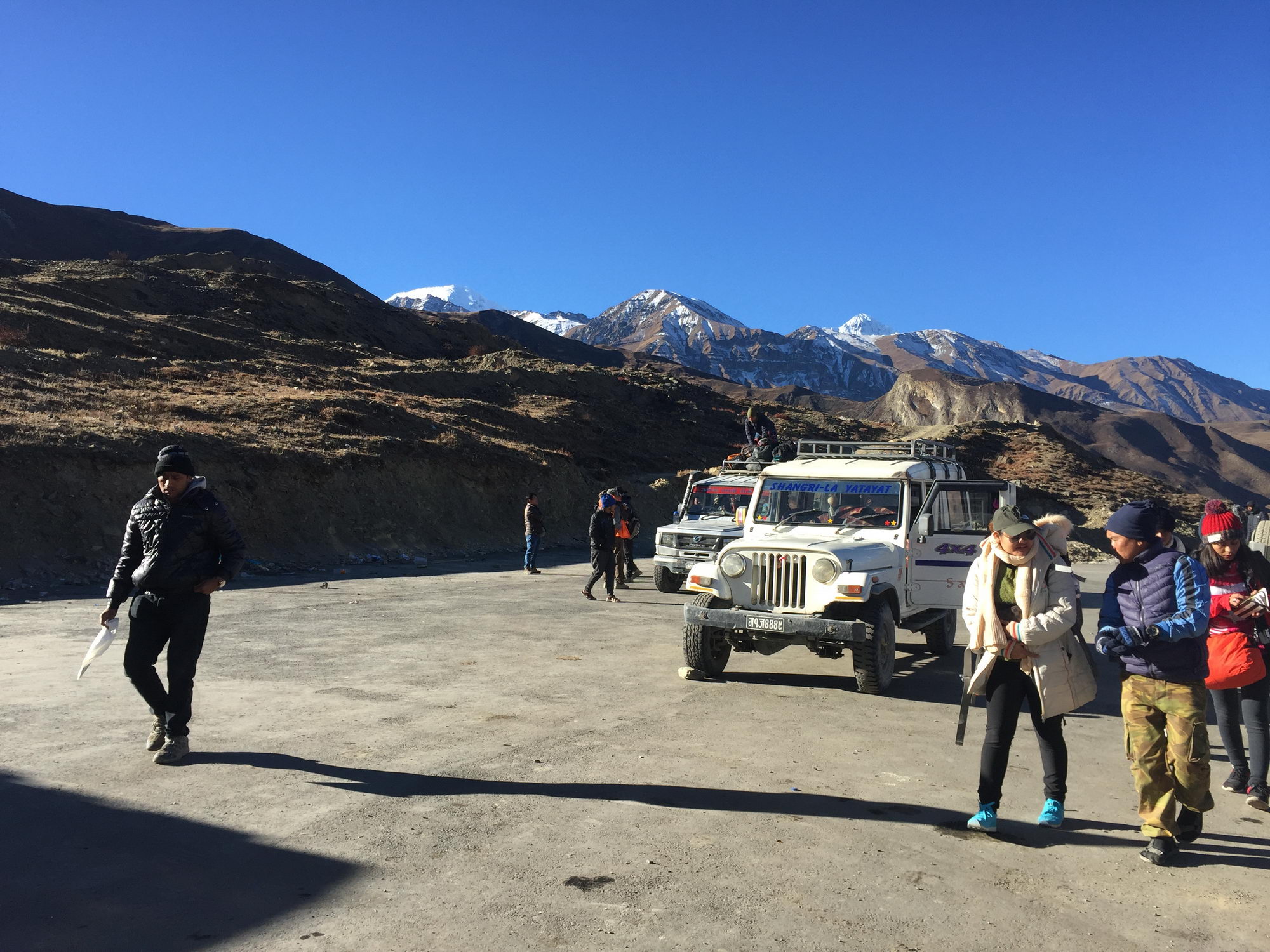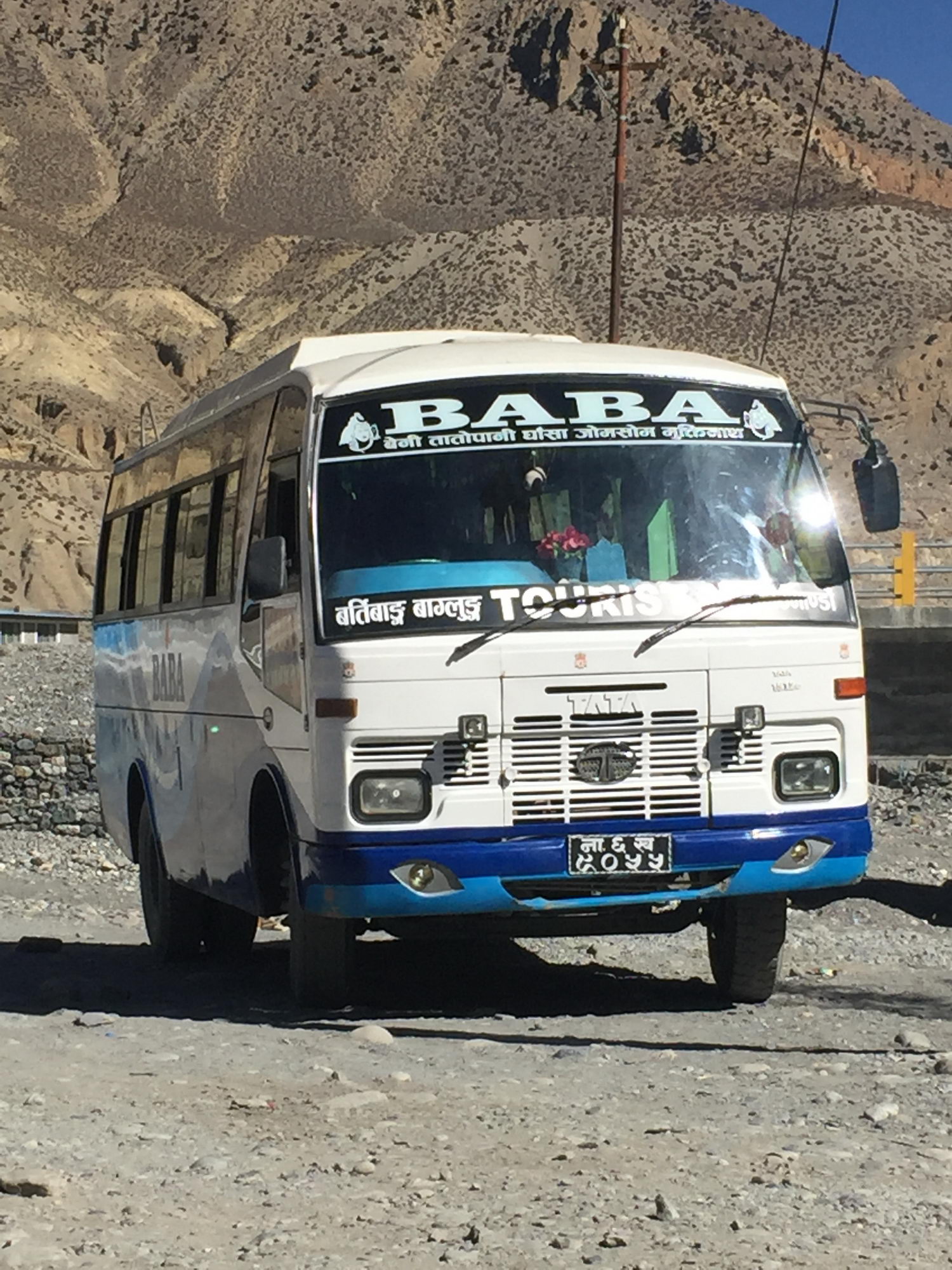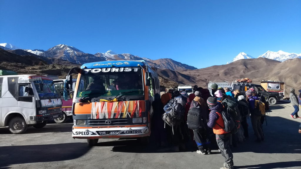 In Jomsom heb je de keuze tussen een bus, jeep of vliegtuig. Een vliegtuig is uiteraard duurst en je kan de dag zelf niet meer vertrekken als je die ter plaatse nog moet boeken. Vooraf boeken is dan weer moeilijk omdat je meestal niet lang vooraf zeker kan zijn wanneer je in Jomsom aankomt. Er raast vaak een felle wind in deze valei, dus je bent ook lang niet zeker dat het vliegtuig de volgende dag vertrekt. Een bus is goedkoopst, maar duurt in het beste geval 10u en is heel oncomfortabel. Een jeep is iets sneller, iets duurder, maar ook hier mag je je verwachten aan een zeer lange rit waarbij je constant door mekaar wordt geschud. Een moeilijke keuze dus, want geen van de opties is ideaal.