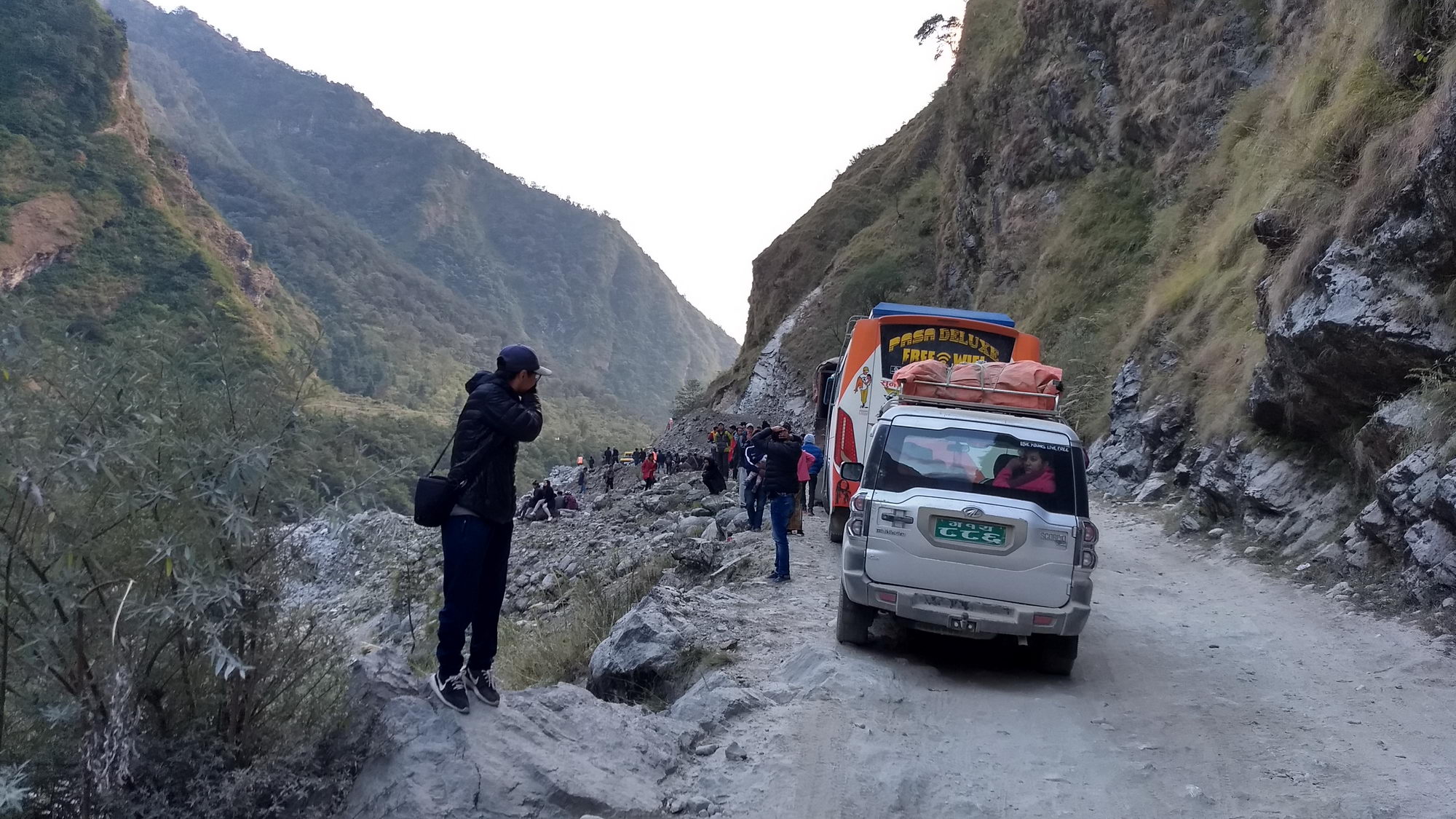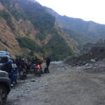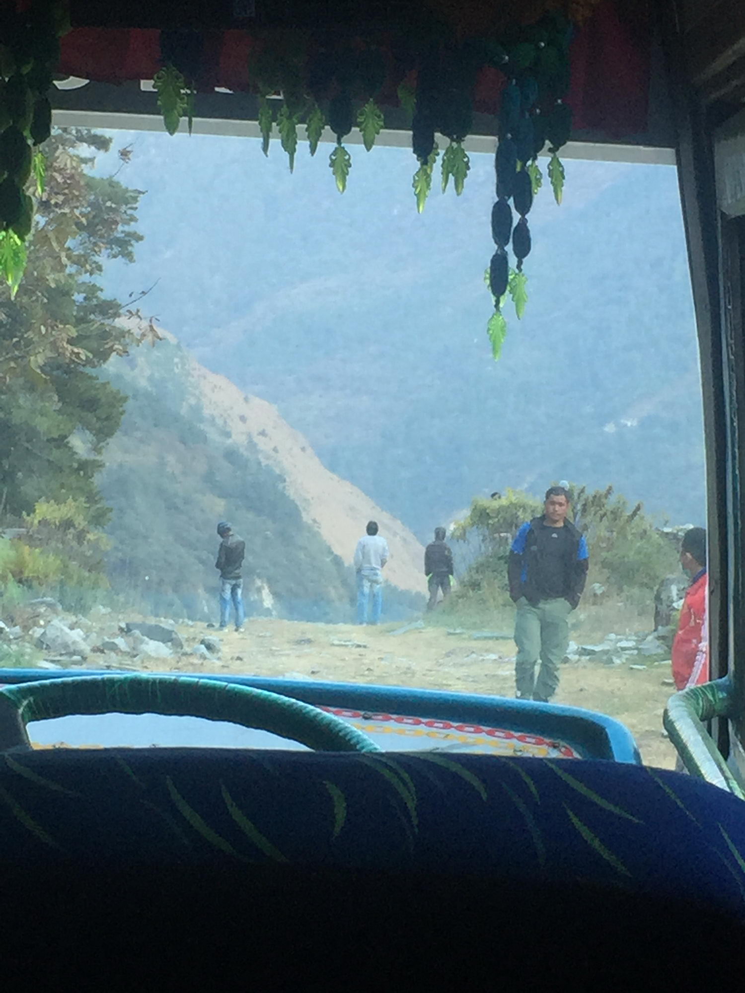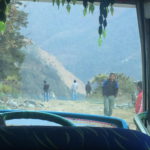 Vanaf nu rijden we terug vlotjes door en de weg kronkelt weer de bergen in. Op een bepaald moment verlaten we de weg door werken en rijden we op een bospad. Na een paar 100 meter stoppen we. Zijn we verkeerd gereden? Neen hoor, sigaretje voor de chauffeur, even een steen verleggen, checken of de bus wel door kan en we zijn opnieuw vertrokken. Even verder staat alle verkeer stil door een landslide. Er wordt een nieuwe weg getrokken door bulldozers en hop we kunnen weer verder! Het wordt stilaan donker, maar de chauffeur blijft van jetje geven. Ik moet zeggen, een goeie chauffeur die blindelings over en langs putten en bulten laveert. Een topchauffeur!