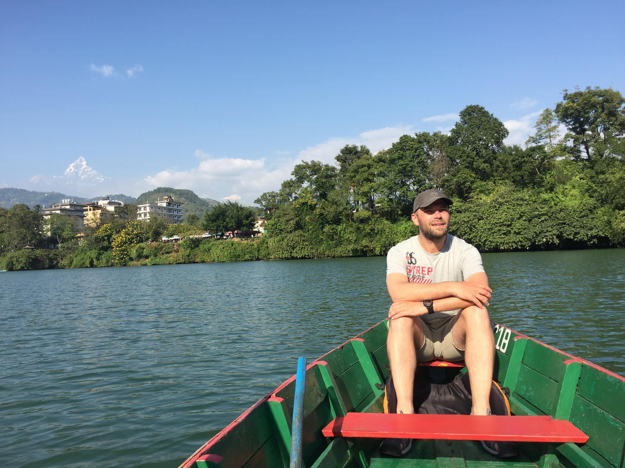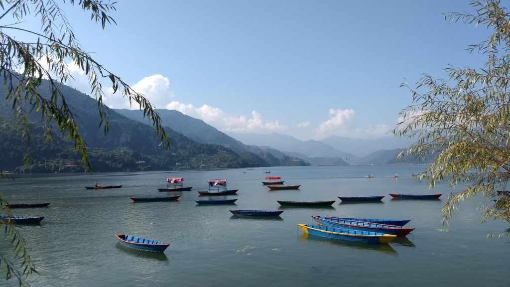 Eigenlijk zijn twee dagen meer dan voldoende om Pokhara te verkennen, maar wij hadden onze vlucht pas op woensdag geboekt. Dus dinsdag was opnieuw een luilekkerdag. Overdag kan het hier nog steeds 25 graden worden, ook al is het herfst. Dolce far niente! In de late namiddag huurden we een roeiboot en genoten we van het zonnetje. Voor 800 rupees kan je voor 1 uur een boot huren, voor 1000 rupees mag je onbeperkt varen. Wil je niet zelf roeien dan kan je voor het dubbele iemand inhuren die een tweetal uur roeit in jouw plaats.