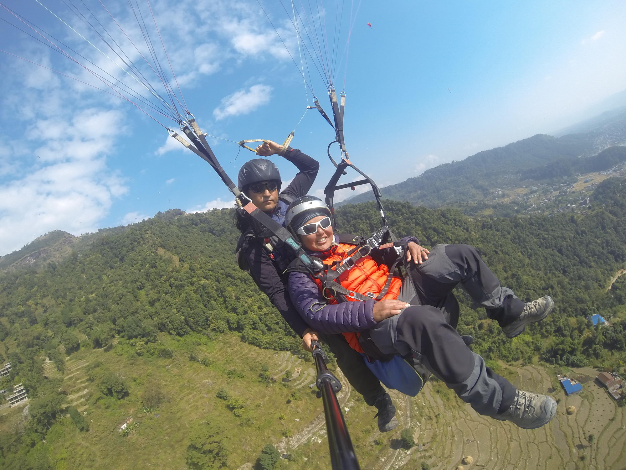 Monday is Paragliding day! Eerst was het nog bewolkt, maar al snel verdwenen de wolken. Oef! Om 11.30 uur moesten we aan het boekingskantoor staan en van daaruit ging het met de taxi naar de paragliding school van Flying Buddha. Van daaruit vertrokken we met de jeep naar Sarankot (1700 m), een rit van ongeveer een half uur. Eénmaal daar ging het vrij vlotjes. We kregen onze begeleider toegewezen, parapentes werden opengerold, harnassen aangetrokken, de klassieke vooraf-foto’s , inhaken en here we go, lopen en niet achteruit hangen en dan hang je in de lucht. Een zalig zicht op Pokhara, de bergen, het meer en rijstvelden. Behalve de wind, die langs je oren suist, is het zalig stil hierboven. Wauw! Puur genieten! Een echte aanrader! Als je geluk hebt met je begeleider vlieg je nog wat acrobatische loops en maak je een scheervlucht over de bomen vooraleer de landing ingezet wordt. De landingszone ligt net naast het meer, dus ook dit is weer een idyllisch plaatje waard. Eénmaal beneden kan je nog even nagenieten met een vers geperst sapje aan een van de stalletjes vooraleer je terug gevoerd wordt naar Pokhara. Trek voor deze activiteit een halve dag uit, want wij waren pas rond 15 uur terug.